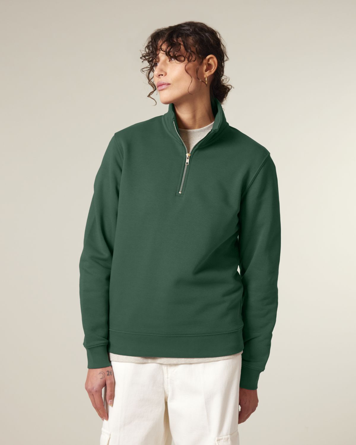Pánská mikina s 1/4 zipem. Vsazené rukávy. Manžety a spodní lem s žebrováním 1x1. Dvojité stehy v průramcích, spodním lemu a manžetách rukávů.