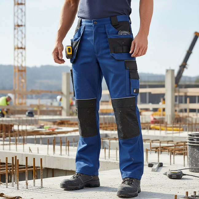 Zpevněná kolenní část z odolného polyesteru 600D umožňuje vložení nákoleníků, což zajišťuje ochranu při klečení. Reflexní prvky zvyšují bezpečnost za horší viditelnosti a pas s gumou v zadní části fixuje kalhoty na místě pro stabilní usazení.
