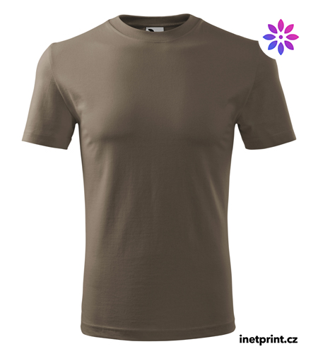 Pánské tričko tubulárního střihu s úzkým lemem průkrčníku z žebrového úpletu 1:1. Vnitřní část průkrčníku je začištěna páskou z vrchového materiálu, ramenní švy jsou zpevněny páskou.