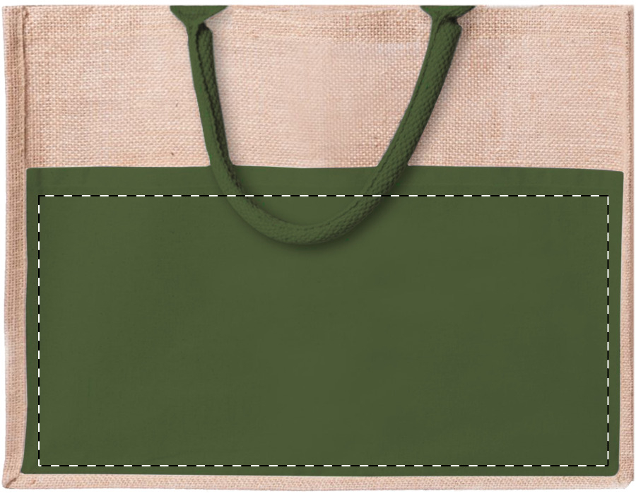 Plážová taška z laminované juty s bavlněnými uchy a přední kapsou.