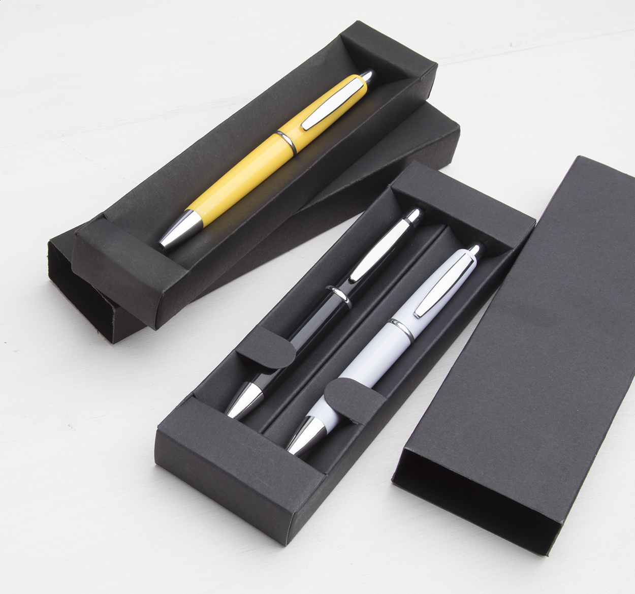 Černá papírová dárková krabička na 1 kuličkové pero.