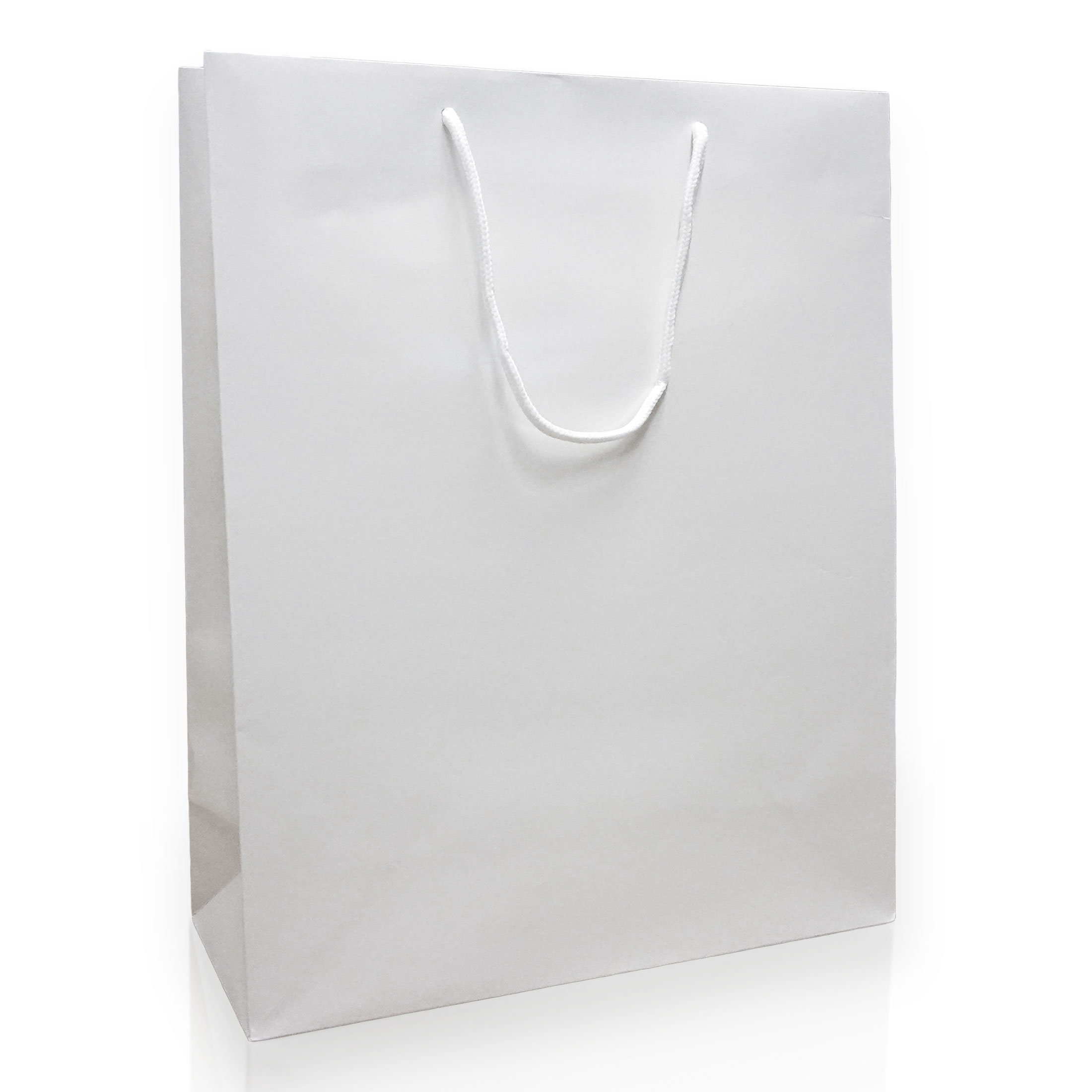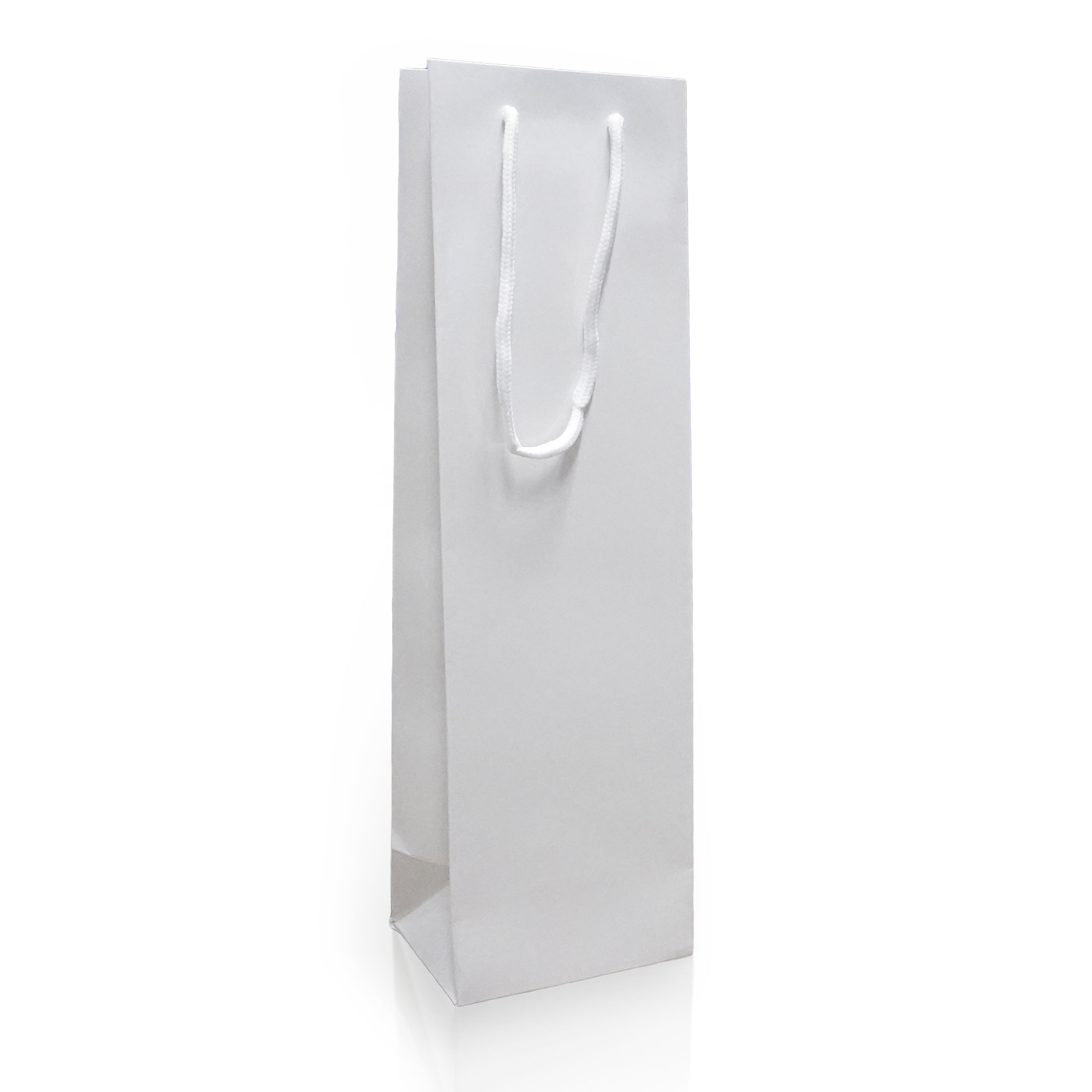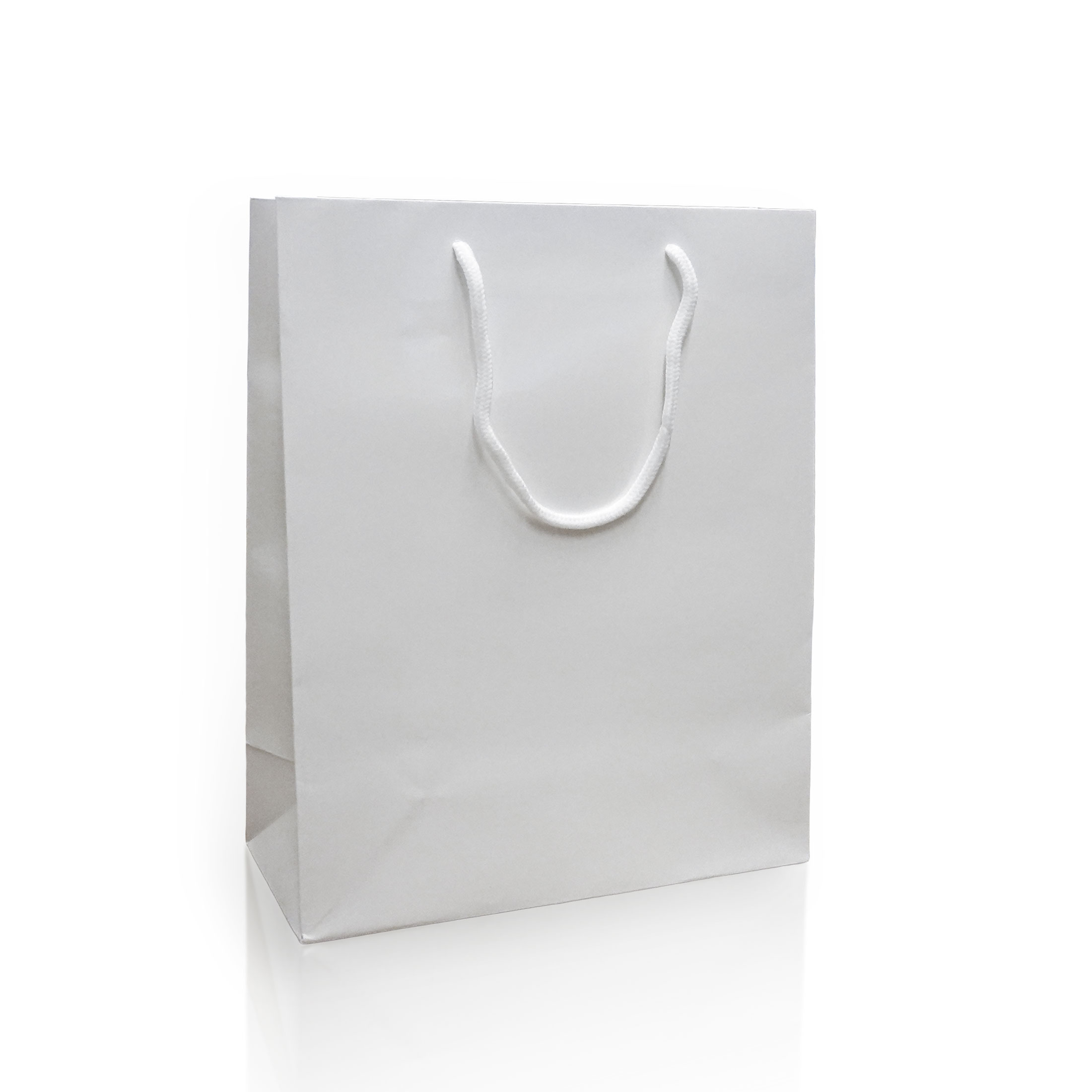 Bílá papírová taška s lesklou laminací a textilními držadly. Chcete-li objednat více různých velikostí včetně potisku, vkládejte varianty do košíku postupně. Nepočítejte branding na více velikostí najednou.
