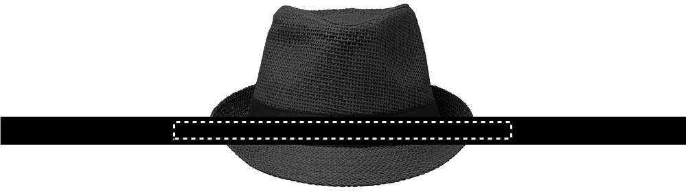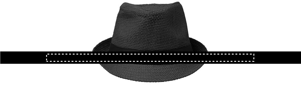 Papírový slaměný klobouk s černým polyesterovým páskem. U objednávek bez potisku se páska dodává nepřipevněná ke klobouku.