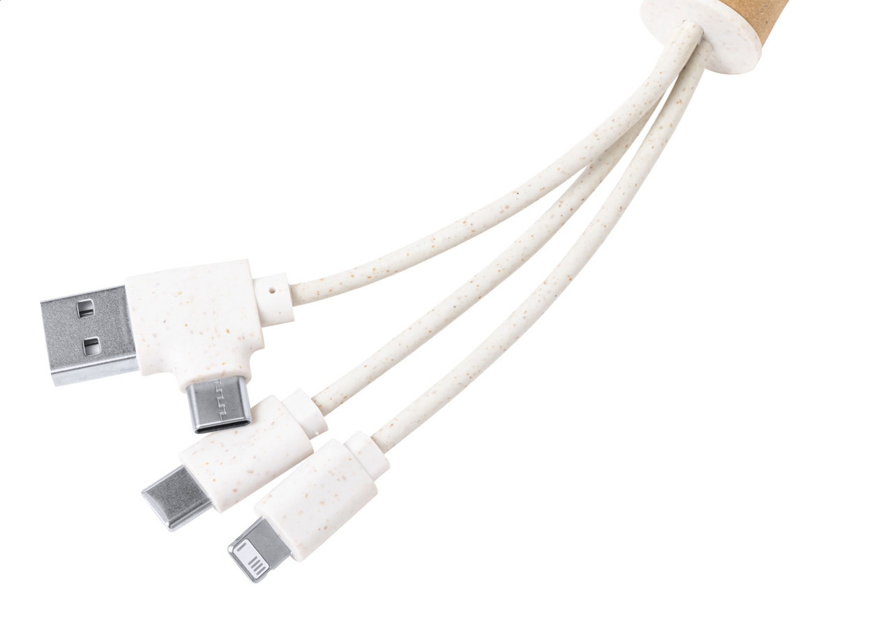 Přívěšek na klíče s USB nabíjecím kabelem z recyklovaného papíru a plastu z pšeničné slámy s konektory micro USB, USB-C a Lightning. Se vstupy USB a USB-C.