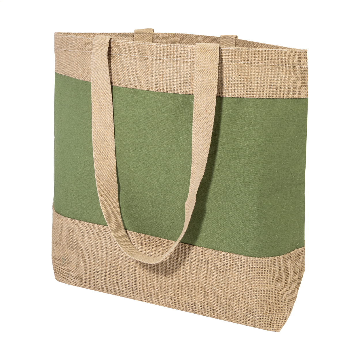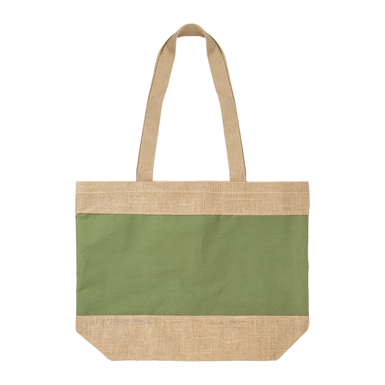 Barevná plážová taška s dlouhými uchy vyrobená z laminované juty a laminované bavlny.