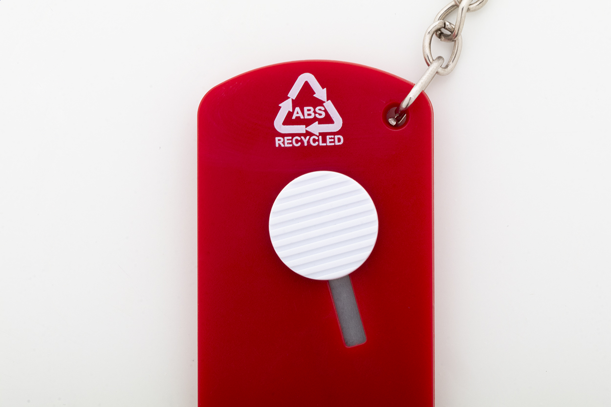 Nůž na papír z recyklovaného ABS plastu a nerezové oceli se samonavíjecí čepelí a kovovým kroužkem na klíče.