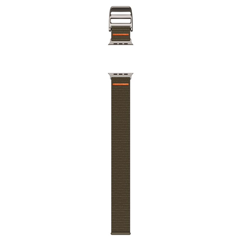 Nylonový řemínek v khaki barvě s kontrastním oranžovým prošíváním poskytuje moderní sportovní styl pro Apple Watch o velikostech 42 mm až 49 mm. Vysoce kvalitní tkanina v kombinaci s pevnou kovovou přezkou garantuje dlouhou životnost a bezpečné upevnění hodinek při jakémkoliv pohybu.