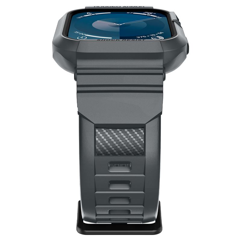 Univerzální řemínek s pouzdrem v tmavě šedé barvě sází na prověřenou ochranu před mechanickým poškozením Apple Watch 45mm a 44mm. Jednodílná konstrukce z odolného TPU obepíná celé tělo hodinek a matný povrch s texturou uhlíkových vláken dodává zařízení profesionální technologický vzhled.