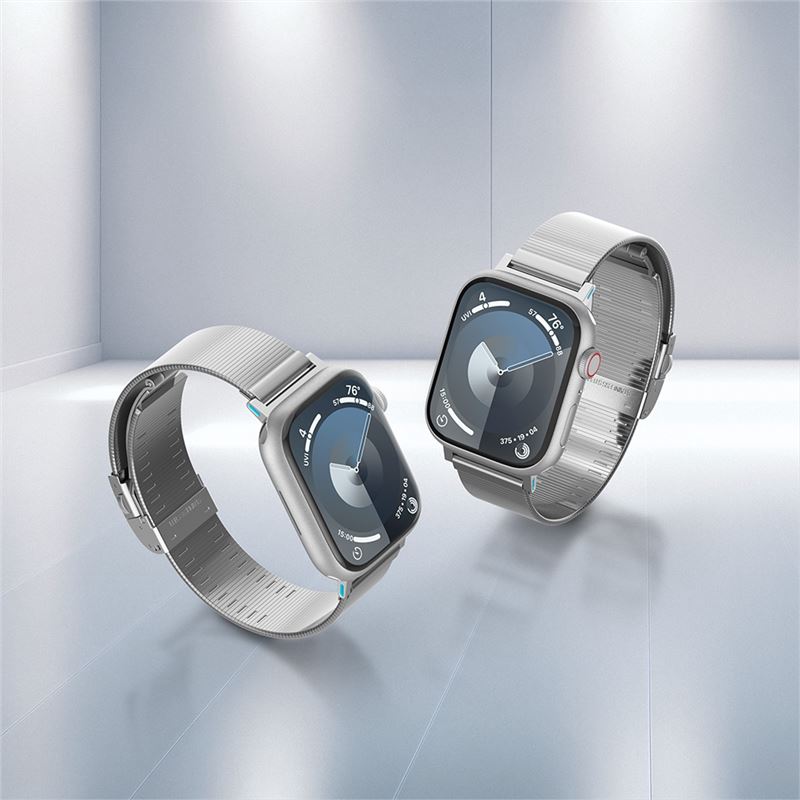Stříbrný kovový řemínek pro Apple Watch o rozměrech 42 mm, 41 mm, 40 mm a 38 mm vyniká svou jemností a prvotřídním zpracováním z nerezové oceli. Štíhlý design působí na zápěstí lehce a elegantně, což z něj činí ideální volbu pro pracovní schůzky i běžné nošení.
