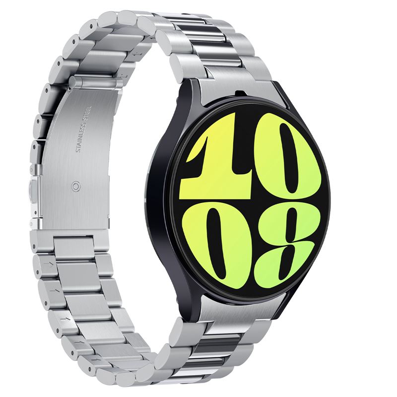 Klasický článkový pásek ve stříbrném odstínu přináší sofistikovaný vzhled pro hodinky Samsung Galaxy Watch7 ve variantách 44 mm i 40 mm. Použitá nerezová ocel 316L vyniká tvrdostí a stálostí barev, což zaručuje zachování luxusního vzhledu i po dlouhodobém nošení.