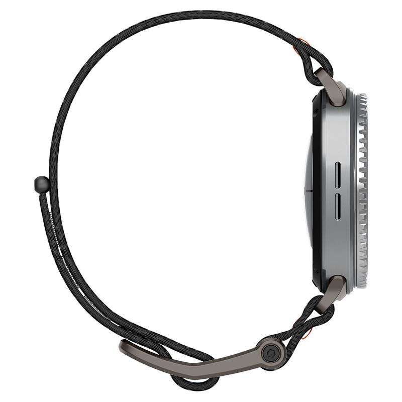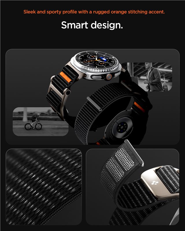 Nylonová tkanina v kombinaci s pevnou kovovou přezkou tvoří vysoce odolný základ pro Samsung Galaxy Watch 8 ve velikostech 40 mm, 44 mm a 46 mm. Černý pásek zdobí decentní oranžové prošívání, které zvýrazňuje sportovní charakter a robustní širší profil.