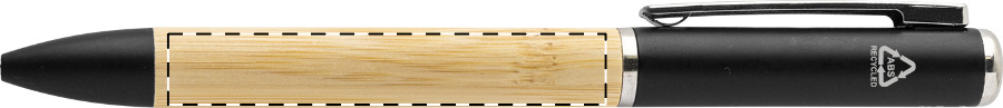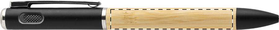 Elegantní černé kuličkové pero kombinuje přírodní bambus s recyklovaným ABS plastem. Integrovaná LED svítilna usnadňuje orientaci v šeru a napájí ji přiložená knoflíková baterie.