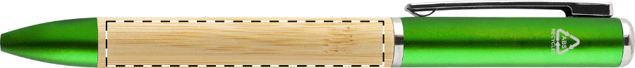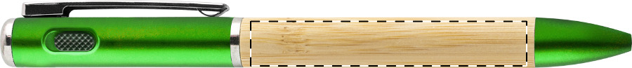 Pracuje s otočným mechanismem a obsahuje modrou náplň spolu s potřebnou knoflíkovou baterií. Zelené detaily doplňují hřejivý vzhled bambusového těla a praktický klip udrží pero na správném místě.