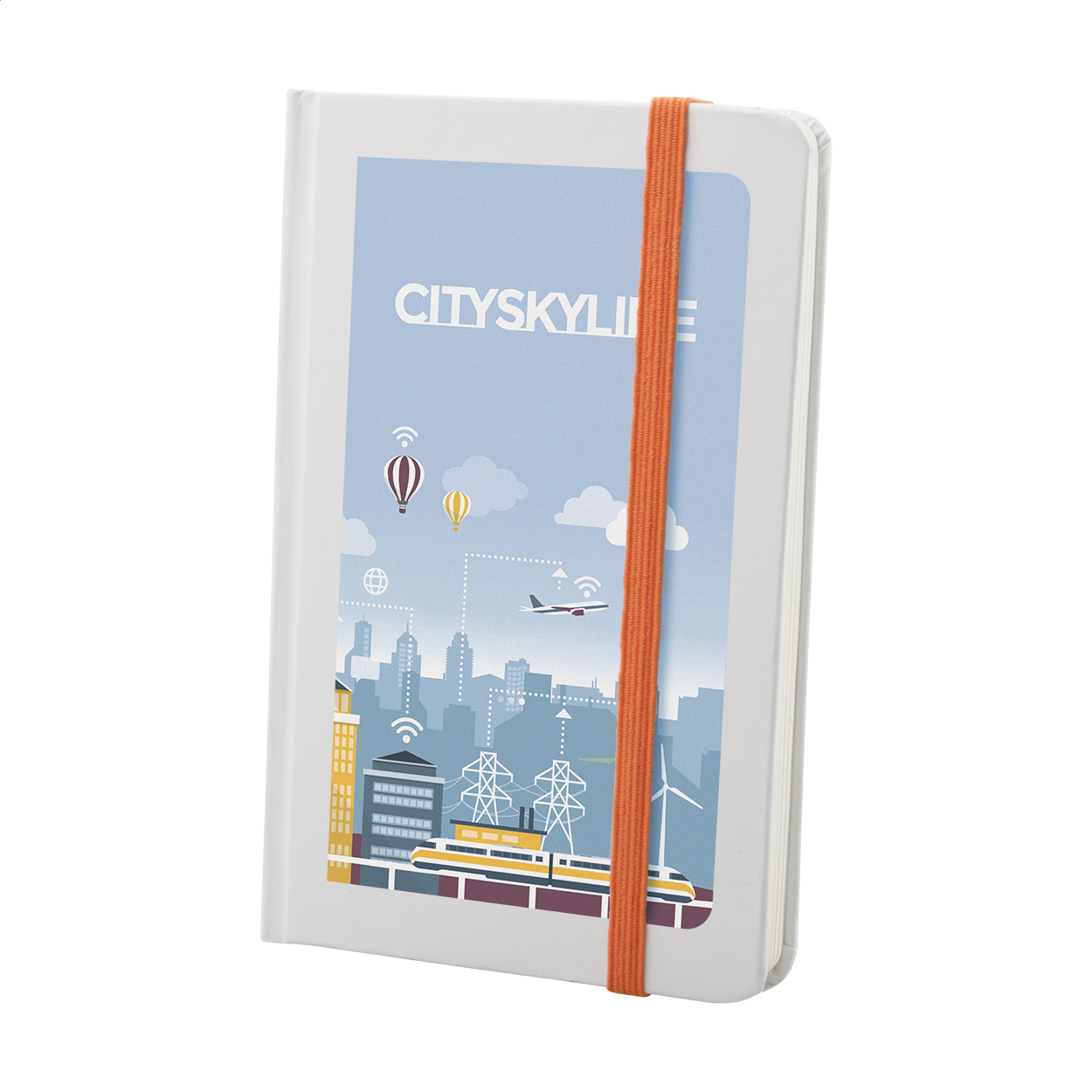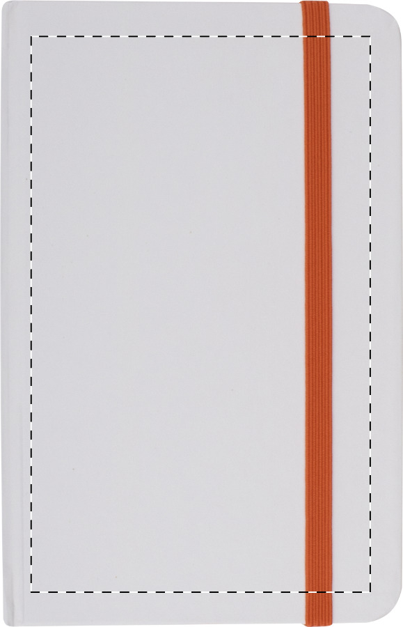 Poznámkový blok s bílými deskami, 80 čistými listy a barevnou gumičkou. Velikost A6.