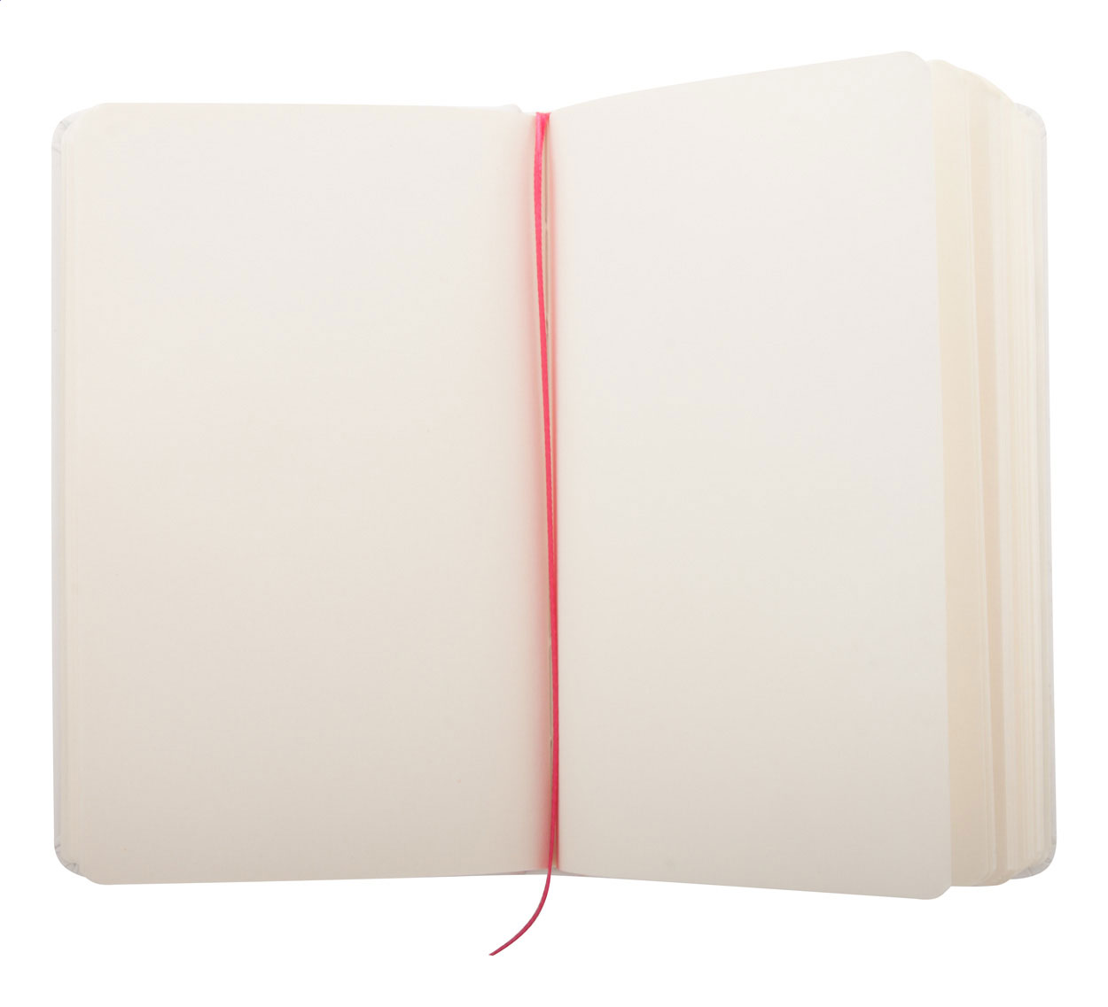 Poznámkový blok s bílými deskami, 80 čistými listy a barevnou gumičkou. Velikost A6.
