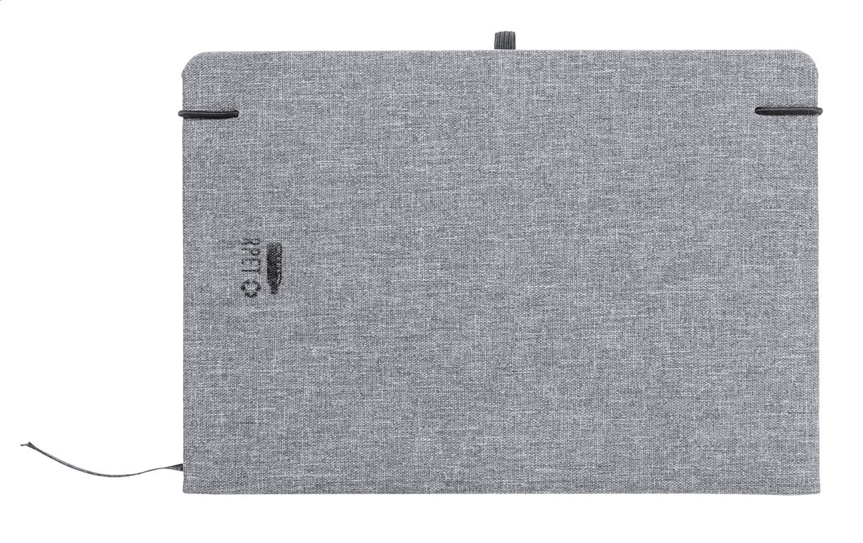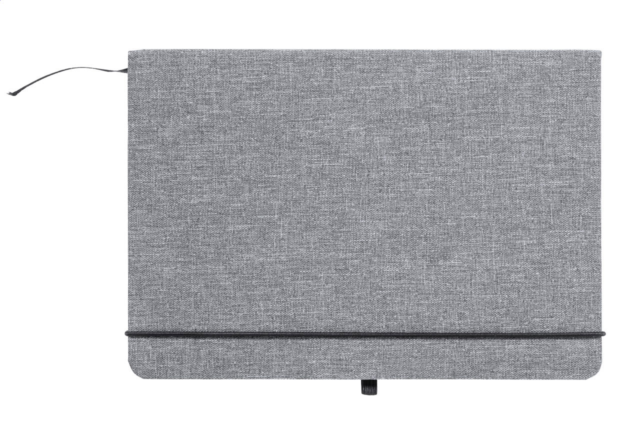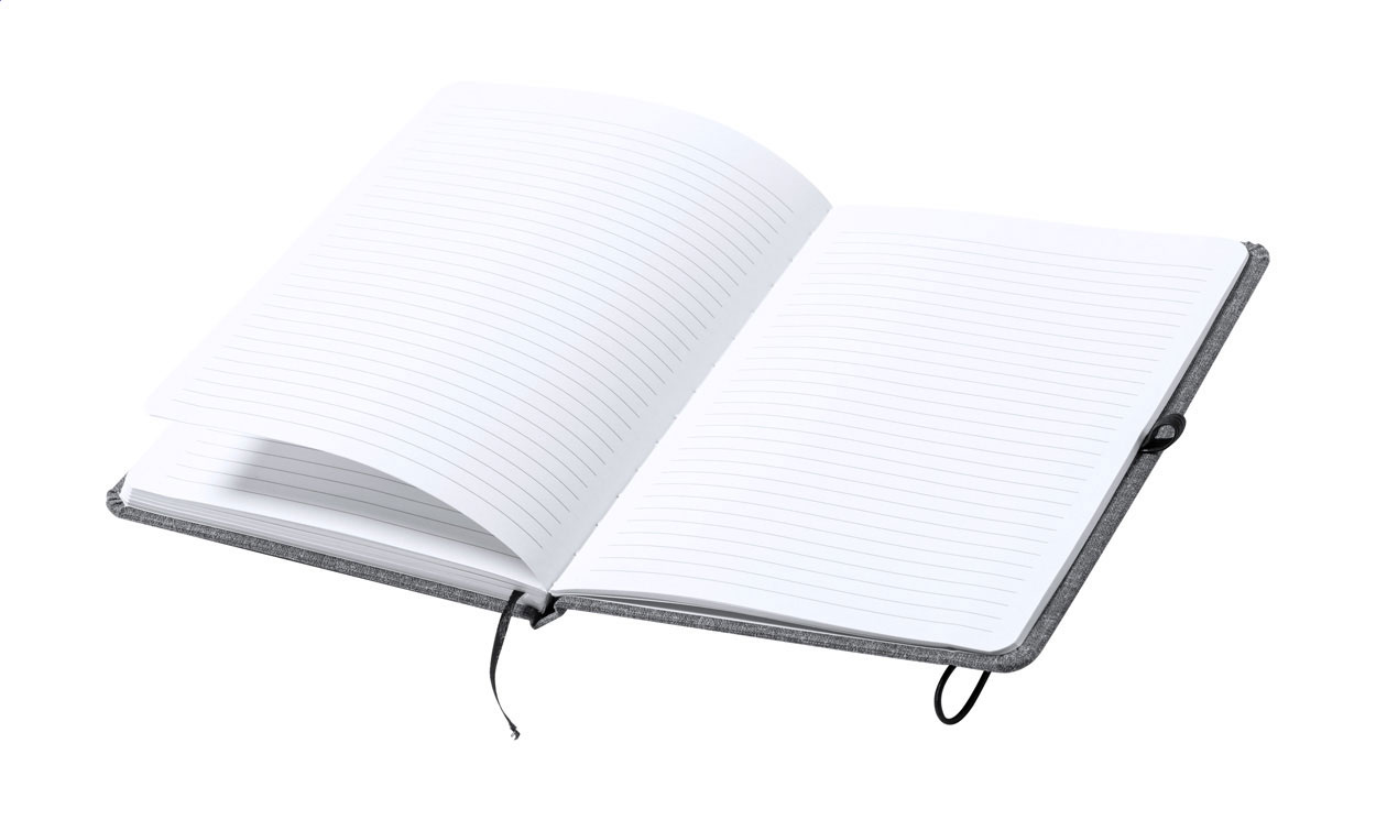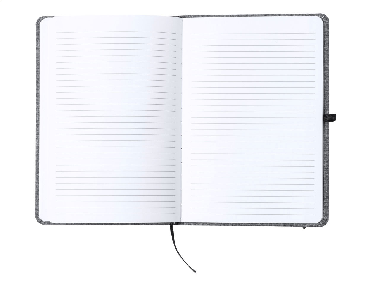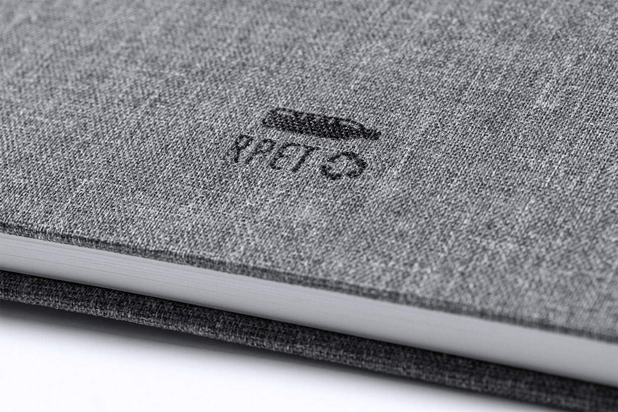 Zápisník potažený recyklovaným polyesterem 600D RPET se 100 linkovanými listy, záložkou a gumičkou. Velikost A5.