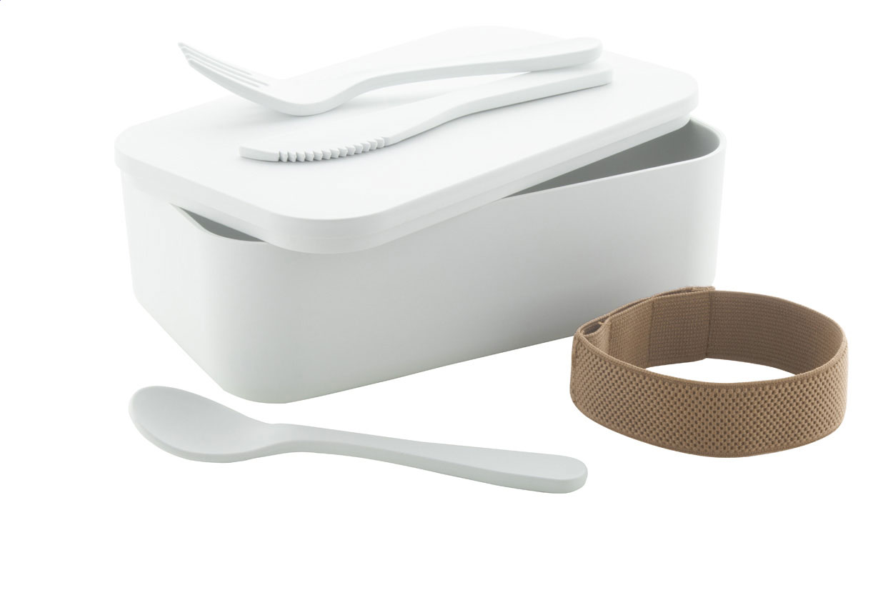 Box na jídlo vyrobený z PLA plastu s příborem (vidlička, lžíce a nůž) a polyesterovým elastickým páskem z RPET (recyklovaný PET). Objem nádoby 1000 ml. Bez BPA, 100% kompostovatelný PLA.