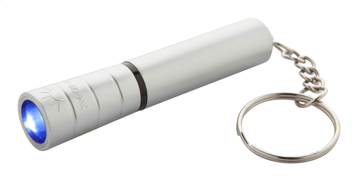Plastová mini baterka s 1 LED, kovovým povrchem a kovovým kroužkem na klíče. S knoflíkovou baterií.