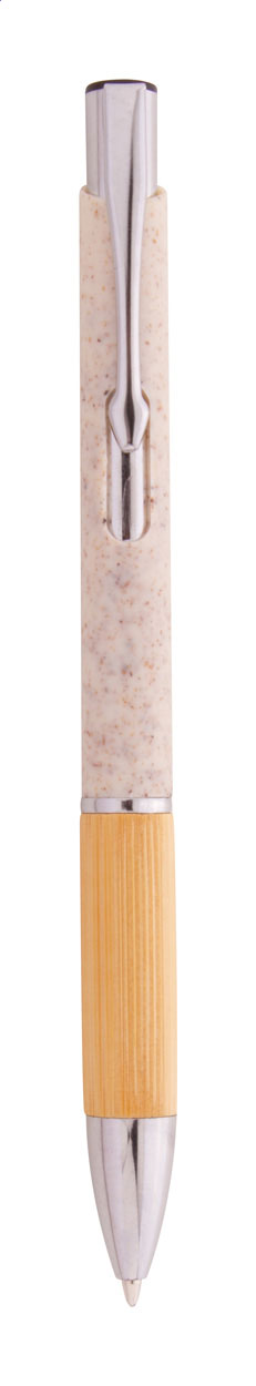 Ekologické plastové kuličkové pero z pšeničné slámy s bambusovým úchopem a kovovými částmi. S modrou náplní. Mechanismus: tlačítkový. Certifikace Push action.