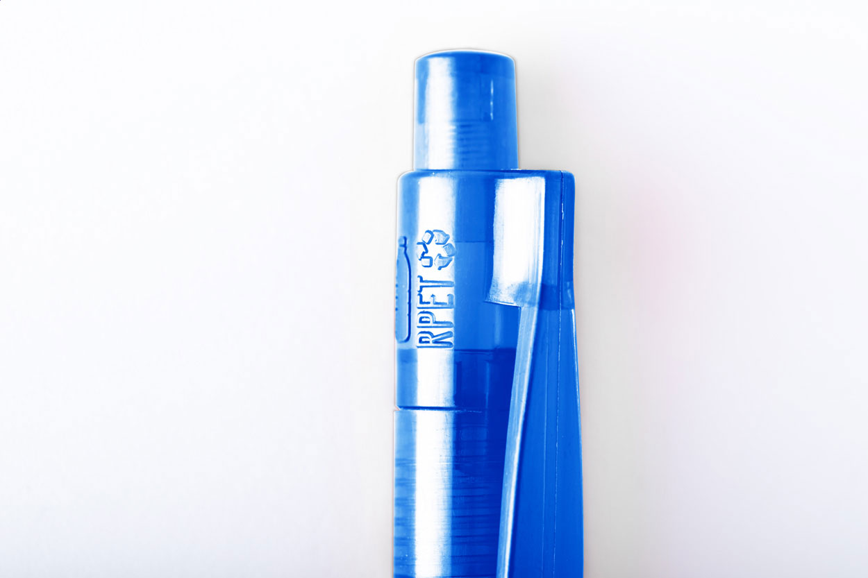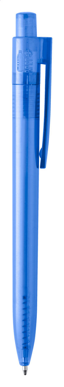 Průhledné plastové kuličkové pero vyrobené z RPET (recyklovaný PET materiál). Modrá náplň. Mechanismus: tlačítkový. Certifikace Push action.