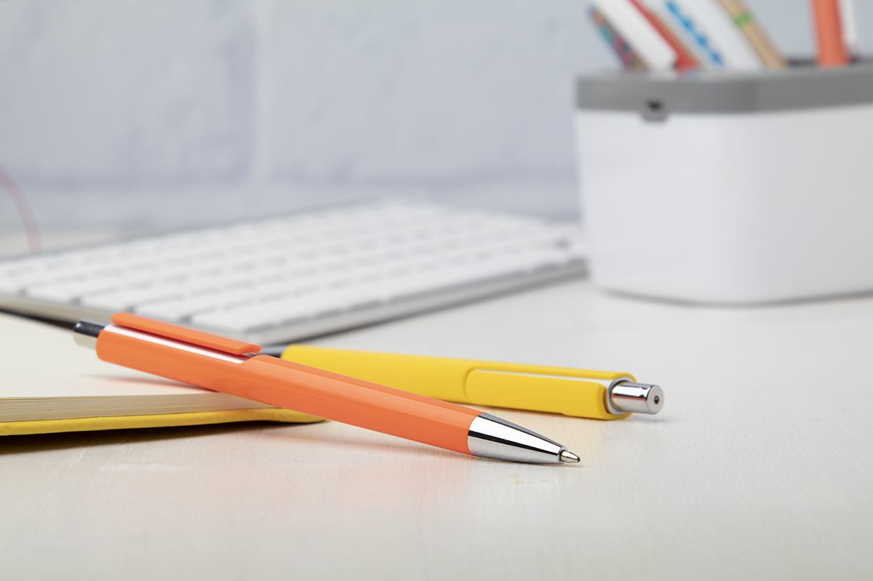 Plastové kuličkové pero s barevným tělem a chromovými částmi. Modrá náplň. Mechanismus: tlačítkový. Certifikace Push action.