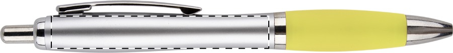 Plastové kuličkové pero s barevným gumovým úchopem a černou náplní. Mechanismus: tlačítkový. Certifikace Push action.