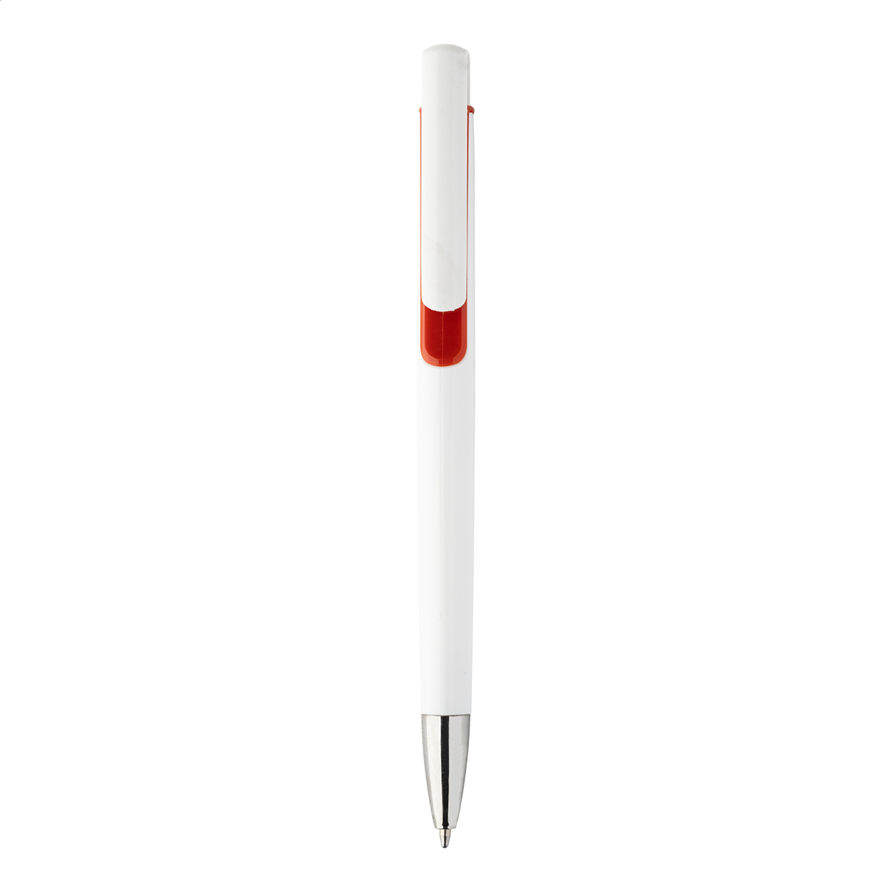 Plastové kuličkové pero s barevnými doplňky a chromovou špičkou. Dodáváno s modrou náplní. Mechanismus: tlačítkový. Certifikace Push action.