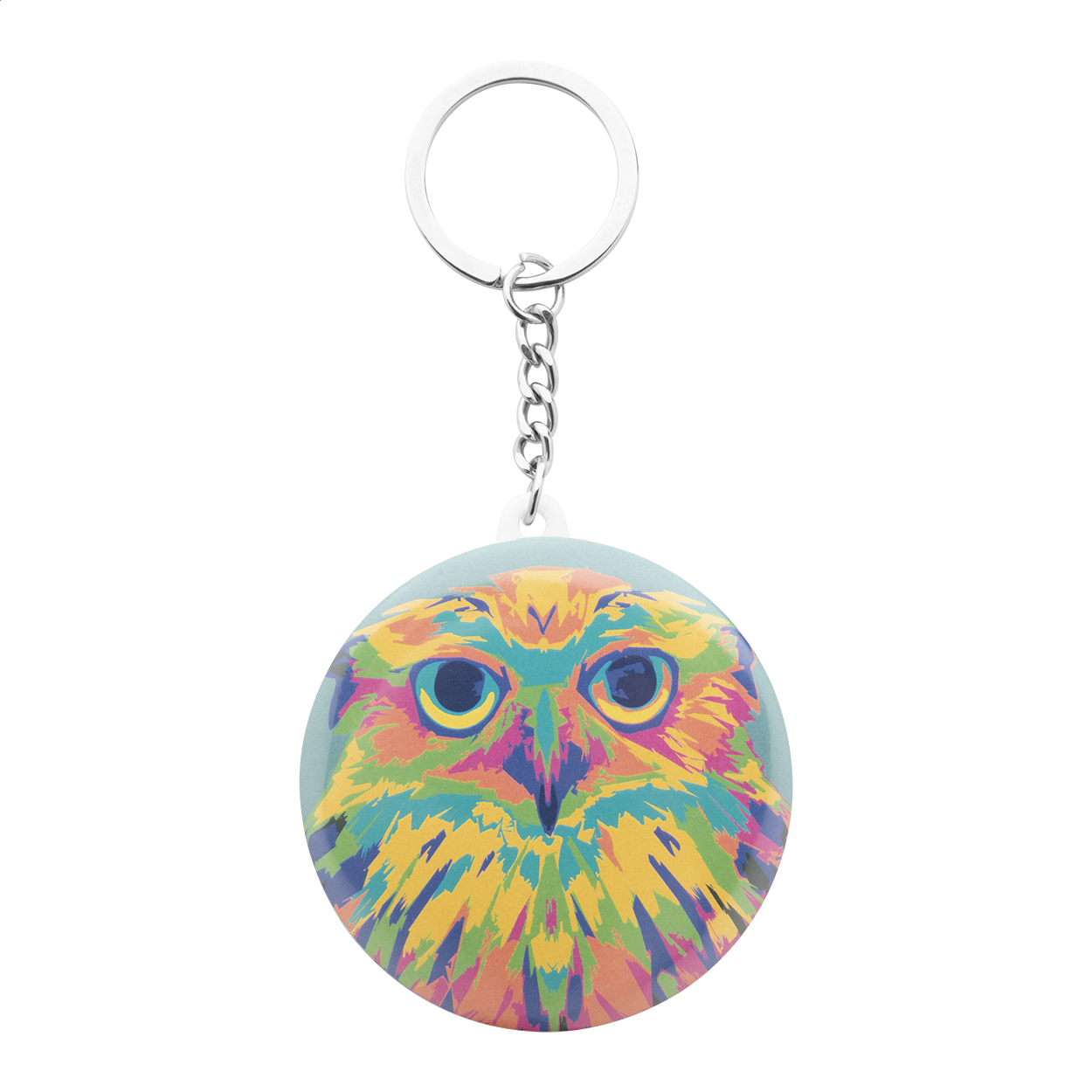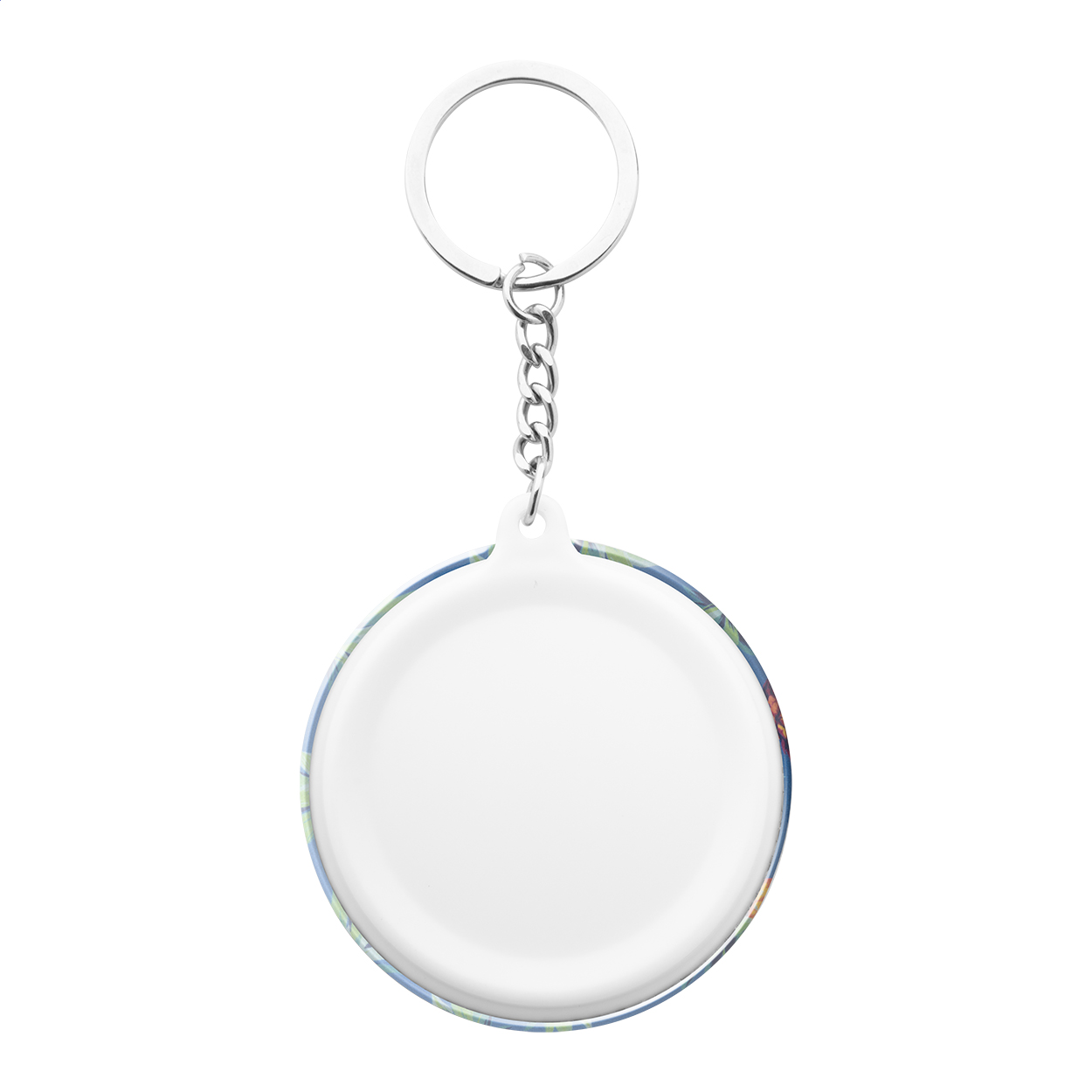Plastový přívěsek na klíče s malým buttonem s plnobarevně potištěným vloženým papírem. Cena zahrnuje digitální tisk, nezahrnuje tiskovou přípravu. Minimální množství pro objednávku: 100 ks.