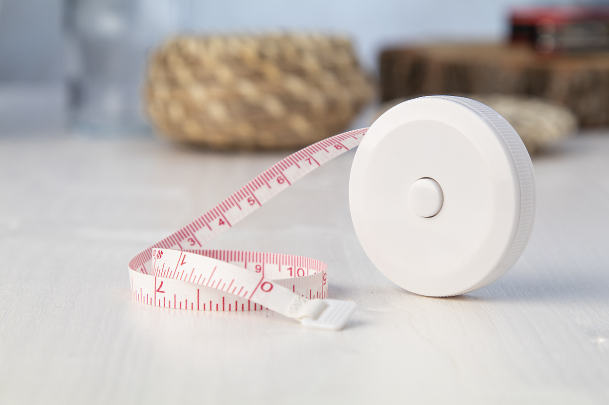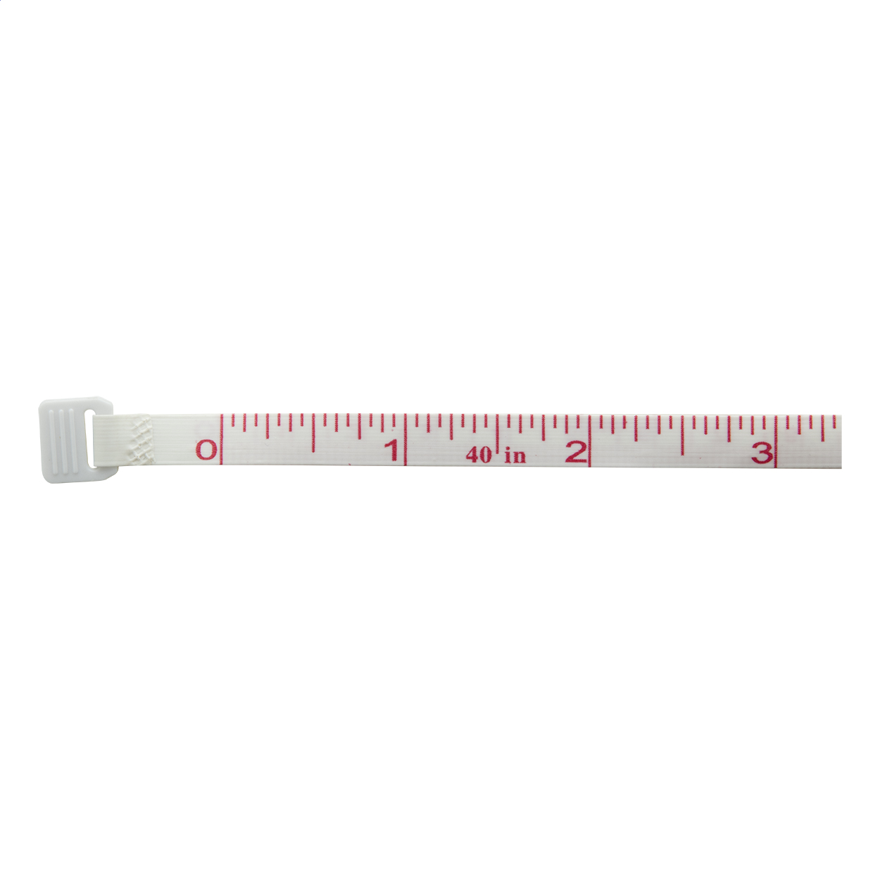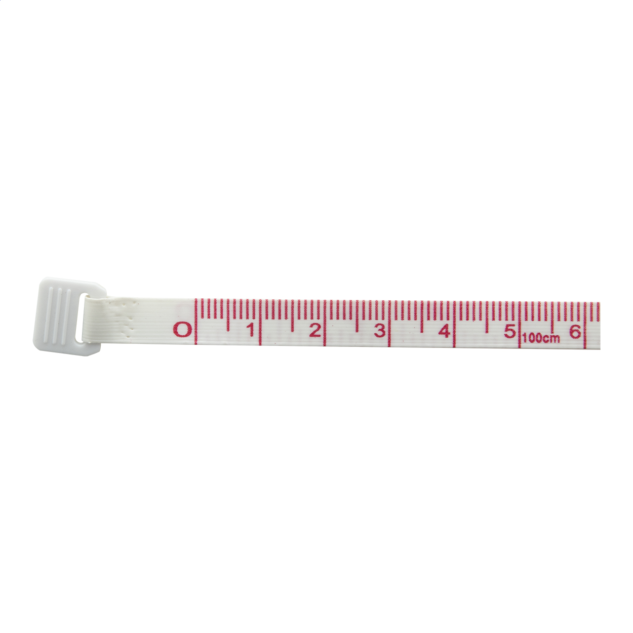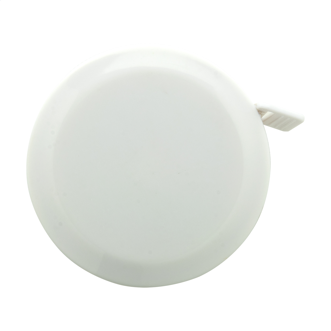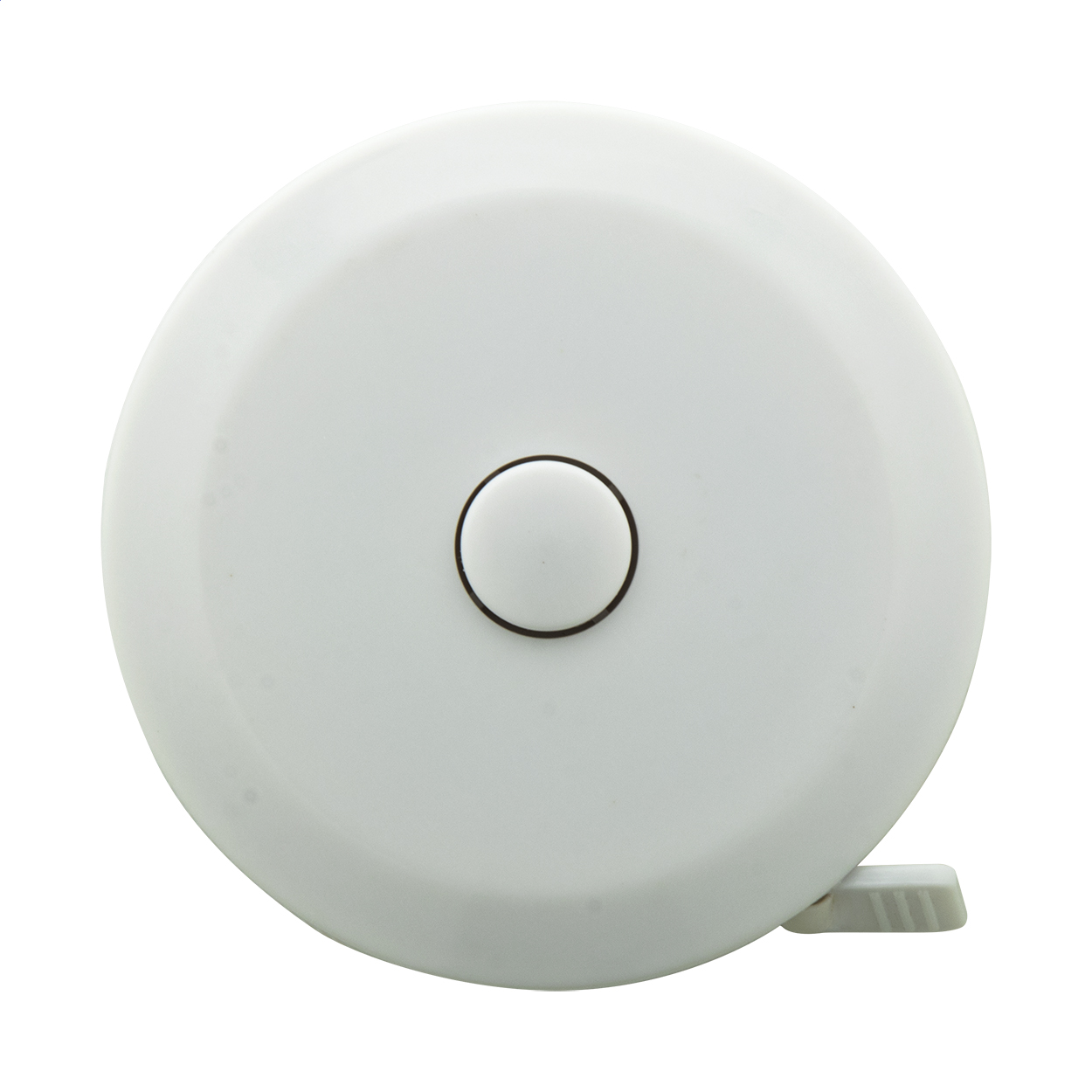 Plastový krejčovský metr s tlačítkem pro navíjení. Délka pásky 1 m. Se stupnicemi v centimetrech i palcích.