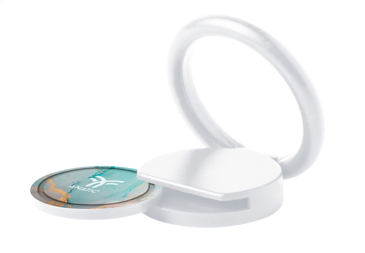 Kulatý plastový stojánek na mobil s protiskluzovou úpravou a mincí do nákupního vozíku.