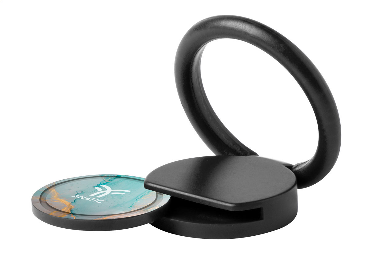 Kulatý plastový stojánek na mobil s protiskluzovou úpravou a mincí do nákupního vozíku.
