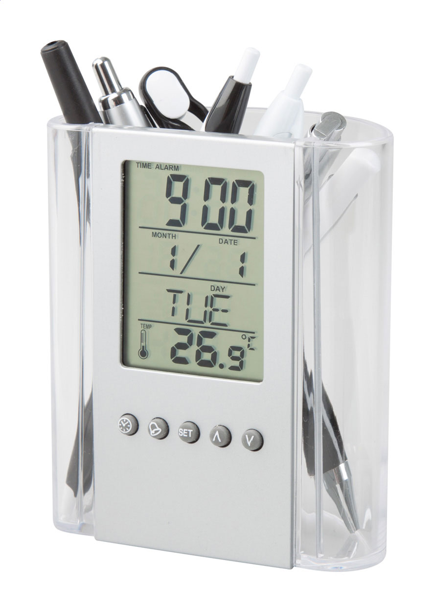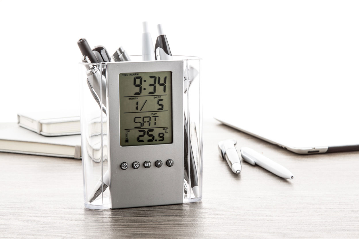 Transparentní plastový stojánek na tužky s digitálním displejem s teploměrem, hodinami, budíkem a kalendářem. Včetně baterií.