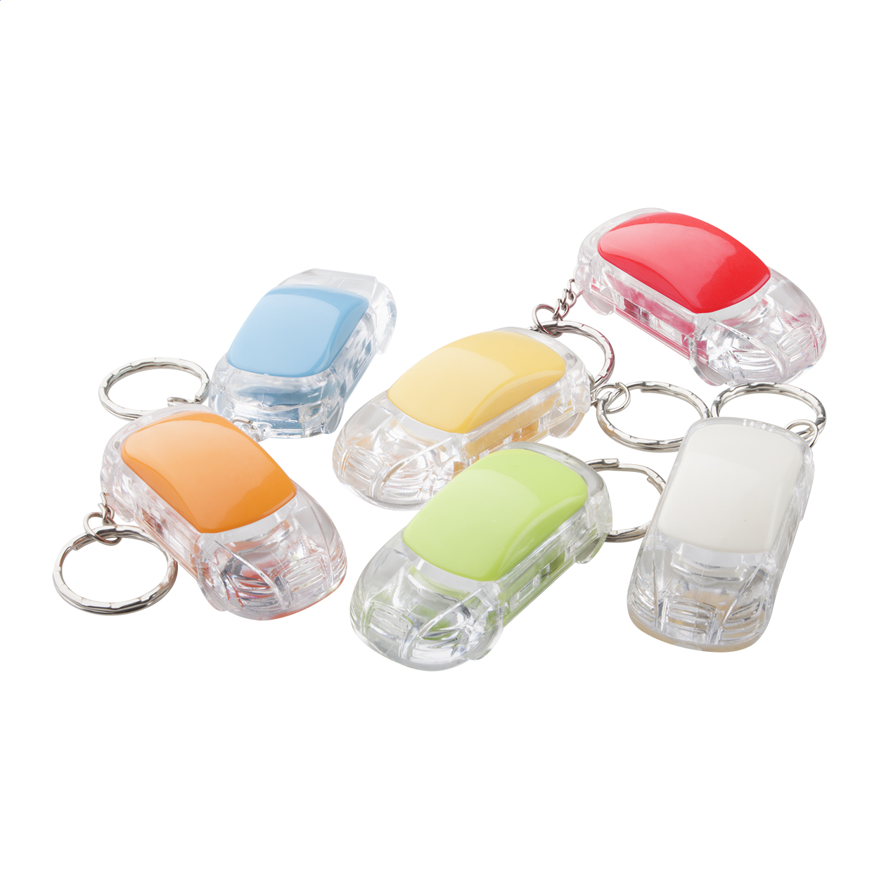 Plastový přívěsek na klíče ve tvaru auta s 1 LED světlem a kovovým kroužkem. Včetně knoflíkové baterie. Baterie nainstalovány: ANO.