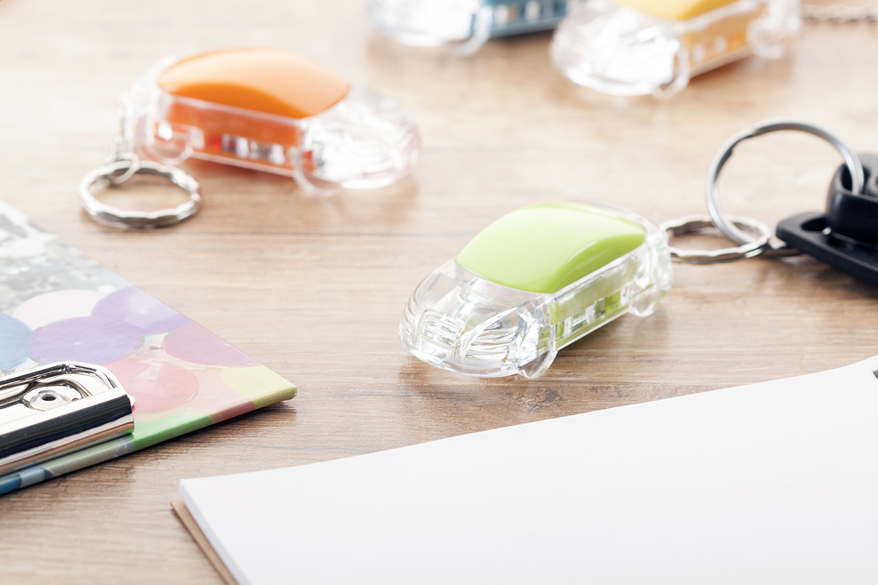 Plastový přívěsek na klíče ve tvaru auta s 1 LED světlem a kovovým kroužkem. Včetně knoflíkové baterie. Baterie nainstalovány: ANO.