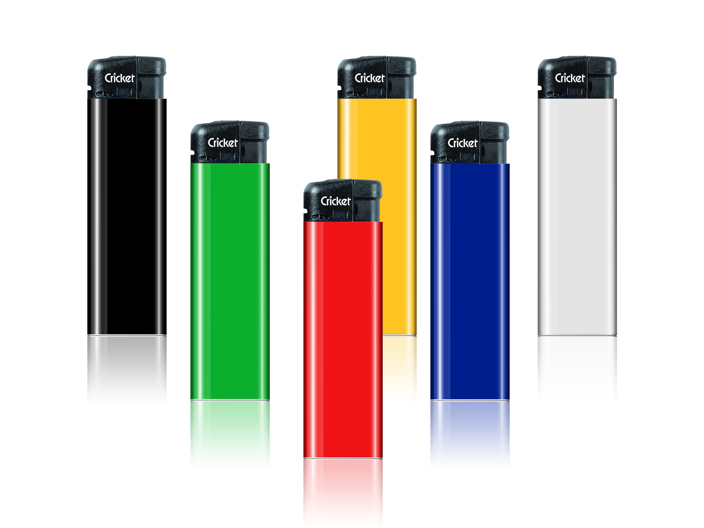 Elektronický plastový plynový zapalovač Cricket. Rozměry: 23x80x10 mm. Standardní balení: 50 kusů/tray. Přepravní karton: 500 ks.