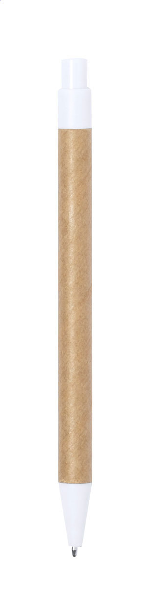Praktický nelinkovaný zápisník formátu A5 s ekologickým designem a přírodními materiály. Obálka je vyrobena z pevného recyklovaného kartonu v přírodní barvě s bílým pruhem a pružnou gumou pro uzavření. Součástí bloku je kuličkové pero z papíru a plastu v odpovídající barvě, které je upevněno v držáku po straně obálky.