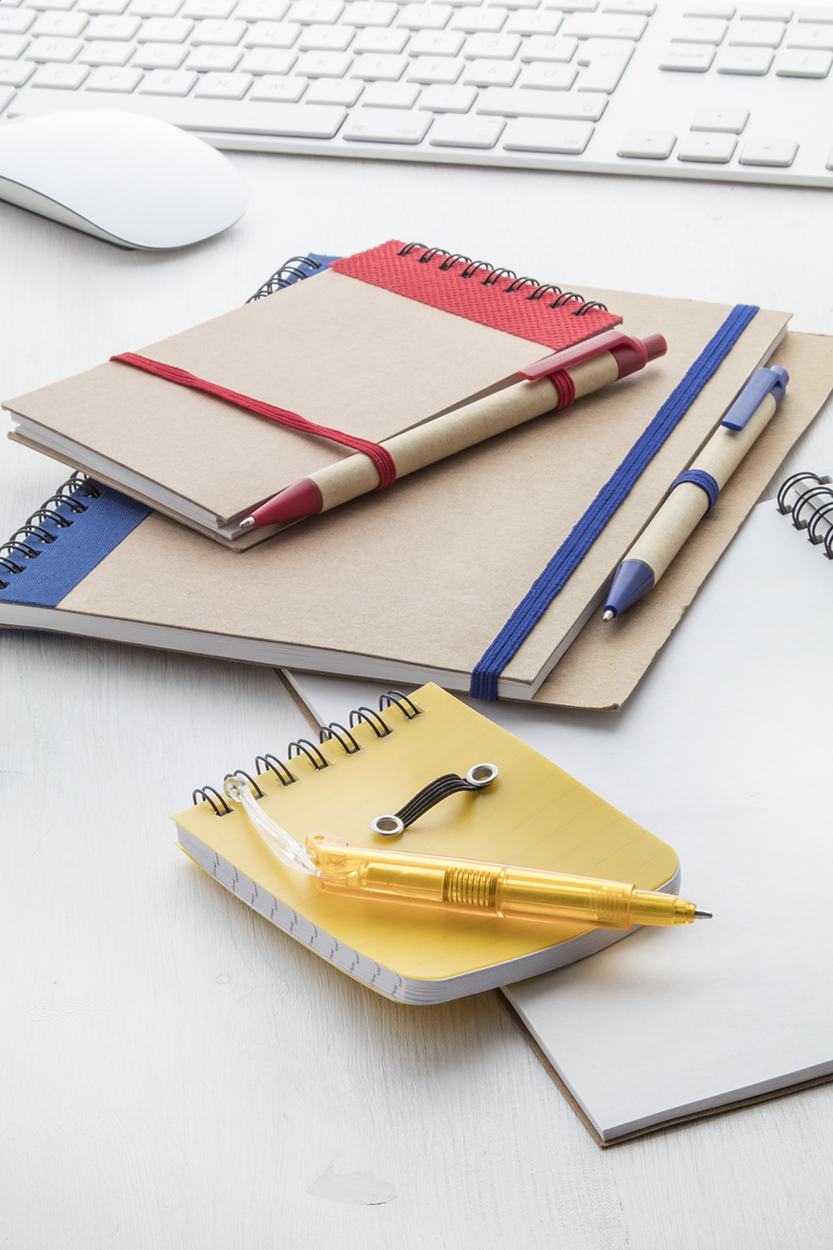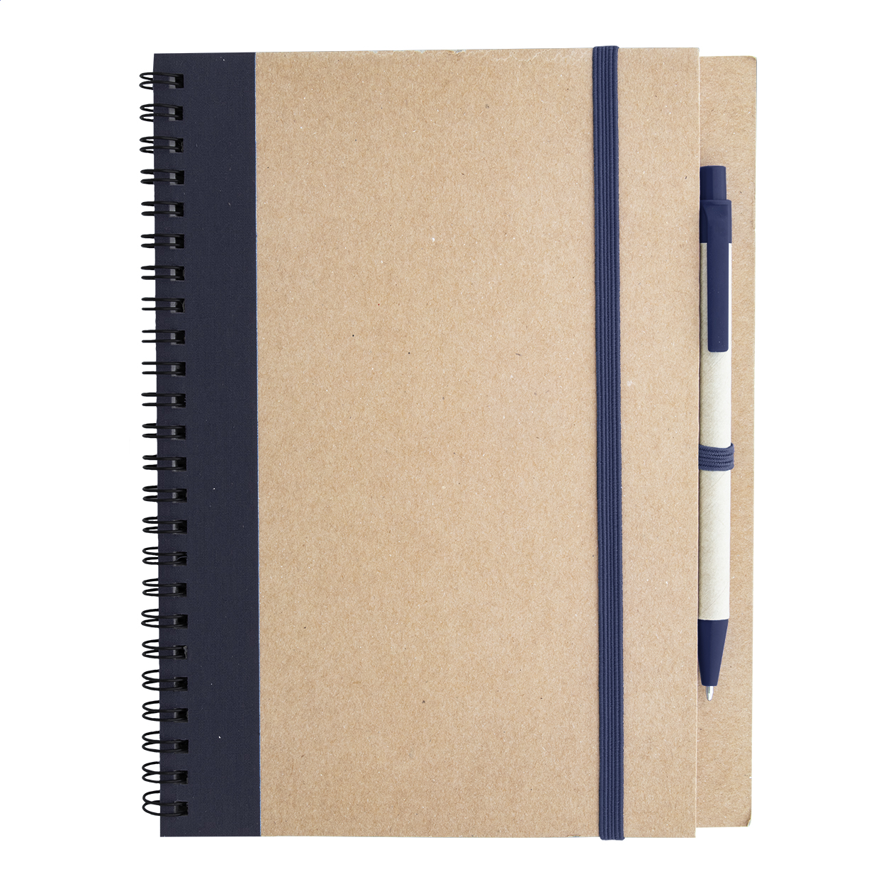 Praktický nelinkovaný zápisník formátu A5 s ekologickým designem a přírodními materiály. Obálka je vyrobena z pevného recyklovaného kartonu v přírodní barvě s tmavě modrým pruhem a pružnou gumou pro uzavření. Součástí bloku je kuličkové pero z papíru a plastu v odpovídající barvě, které je upevněno v držáku po straně obálky.