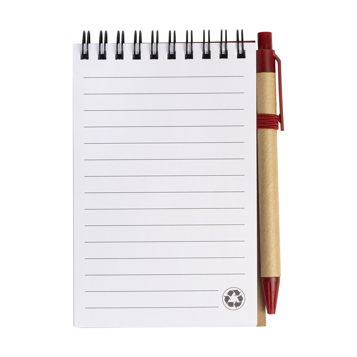 Blok ve spirále z recyklovaného papíru se 70 linkovanými listy a kuličkovým perem z recyklovaného papíru s modrou náplní. Velikost A6.