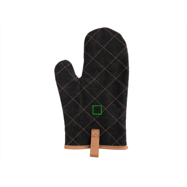 Stylová kuchyňská chňapka vyrobená z odolného plátna gramáže 450 g/m2 s detaily z umělé kůže (PU). Baleno v dárkové krabičce z kraftového papíru. Perte na 30 °C s podobnými barvami.
