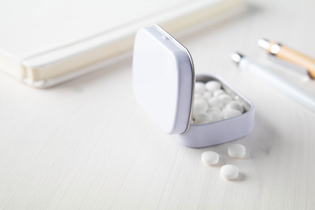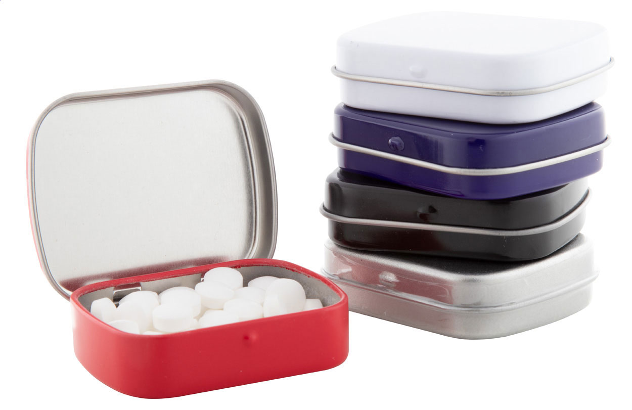 Obdélníková plechová krabička s 25 gramy mátových bonbónů bez cukru.