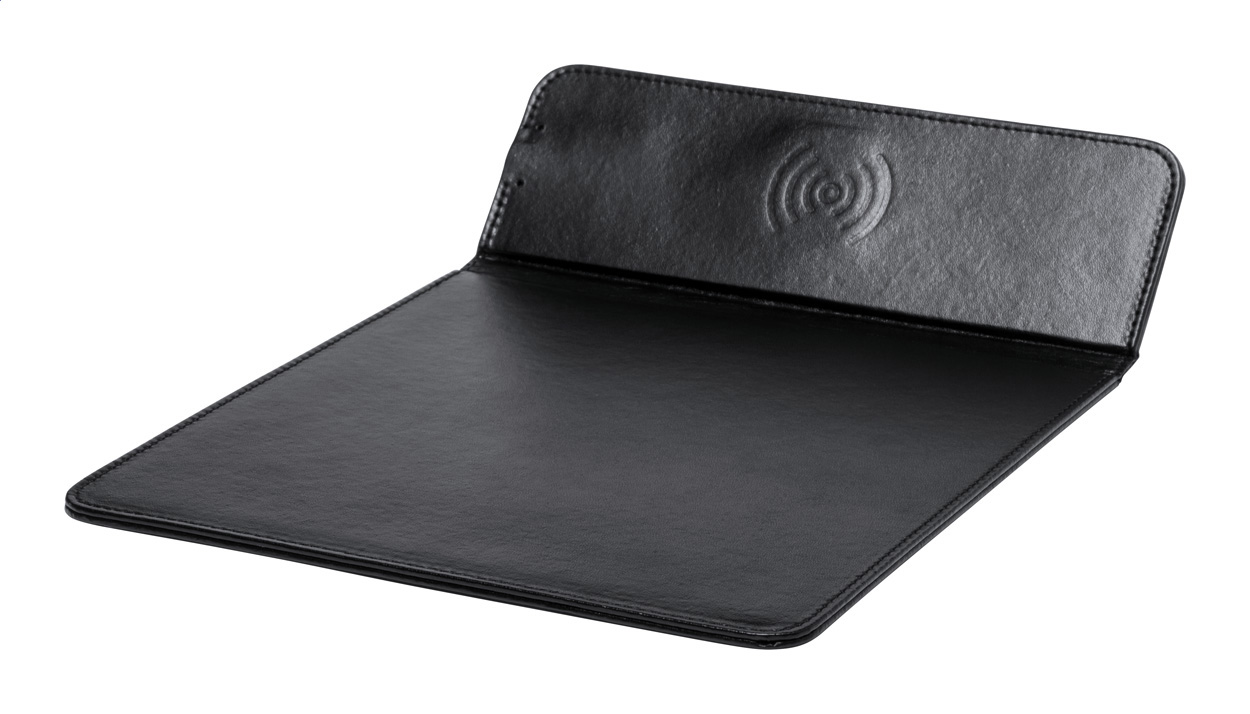 Podložka pod myš z PU kůže s vestavěnou bezdrátovou nabíječkou na mobil a s funkcí stojánku na mobil.