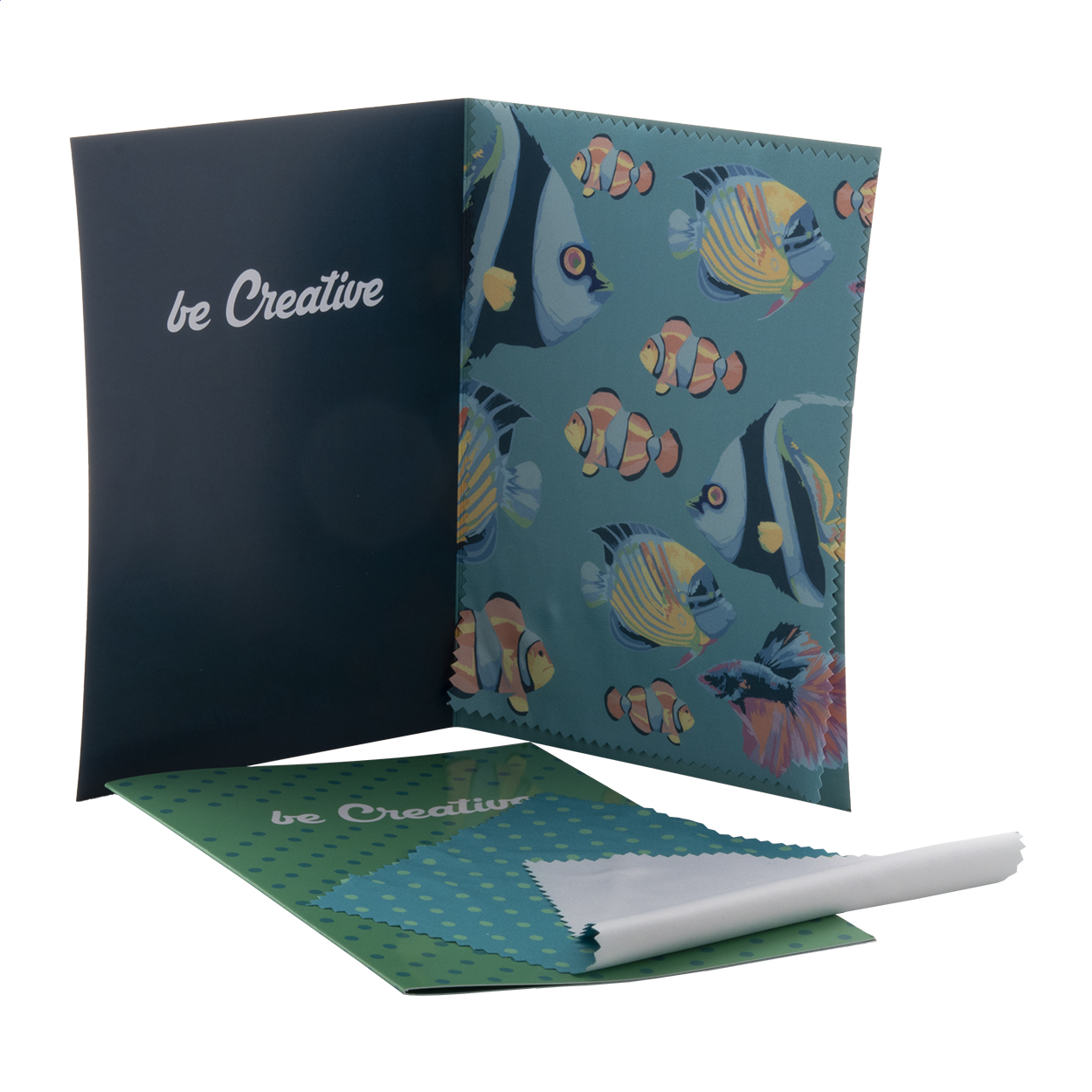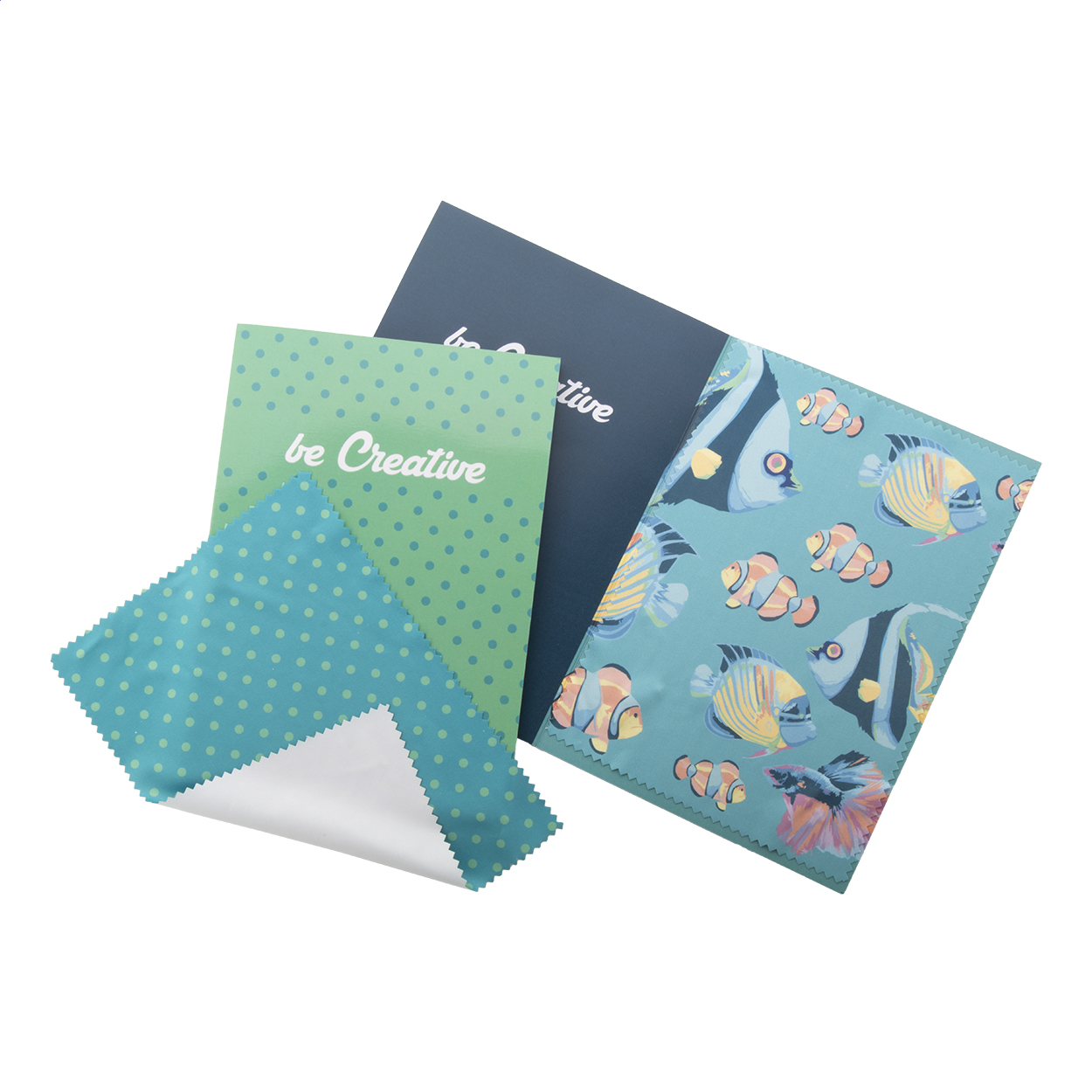 Papírová pohlednice s vlastní grafikou na obou stranách. Vč. čistícího hadříku na brýle (180 g/m²) z mikrovlákna se sublimačním potiskem. Cena zahrnuje digitální a sublimační tisk, nezahrnuje tiskovou přípravu. Min. mn.: 100 ks.