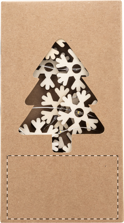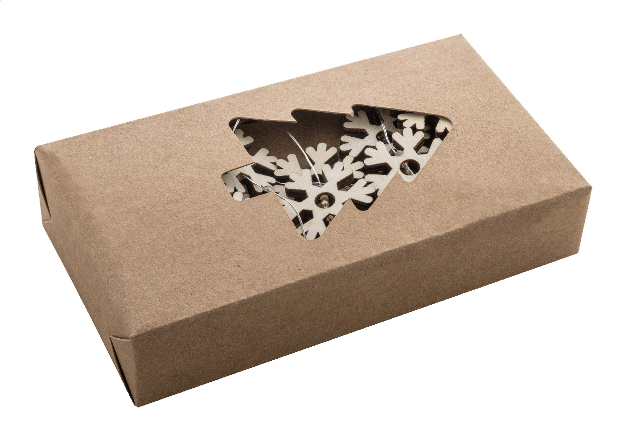 Vánoční světelná dekorace s 20 LED světly ve tvaru dřevěné sněhové vločky. Funguje na 2 AA baterie, bez baterií. S tlačítkem ZAP/VYP na pouzdře na baterie. V krabičce z kraftového papíru.