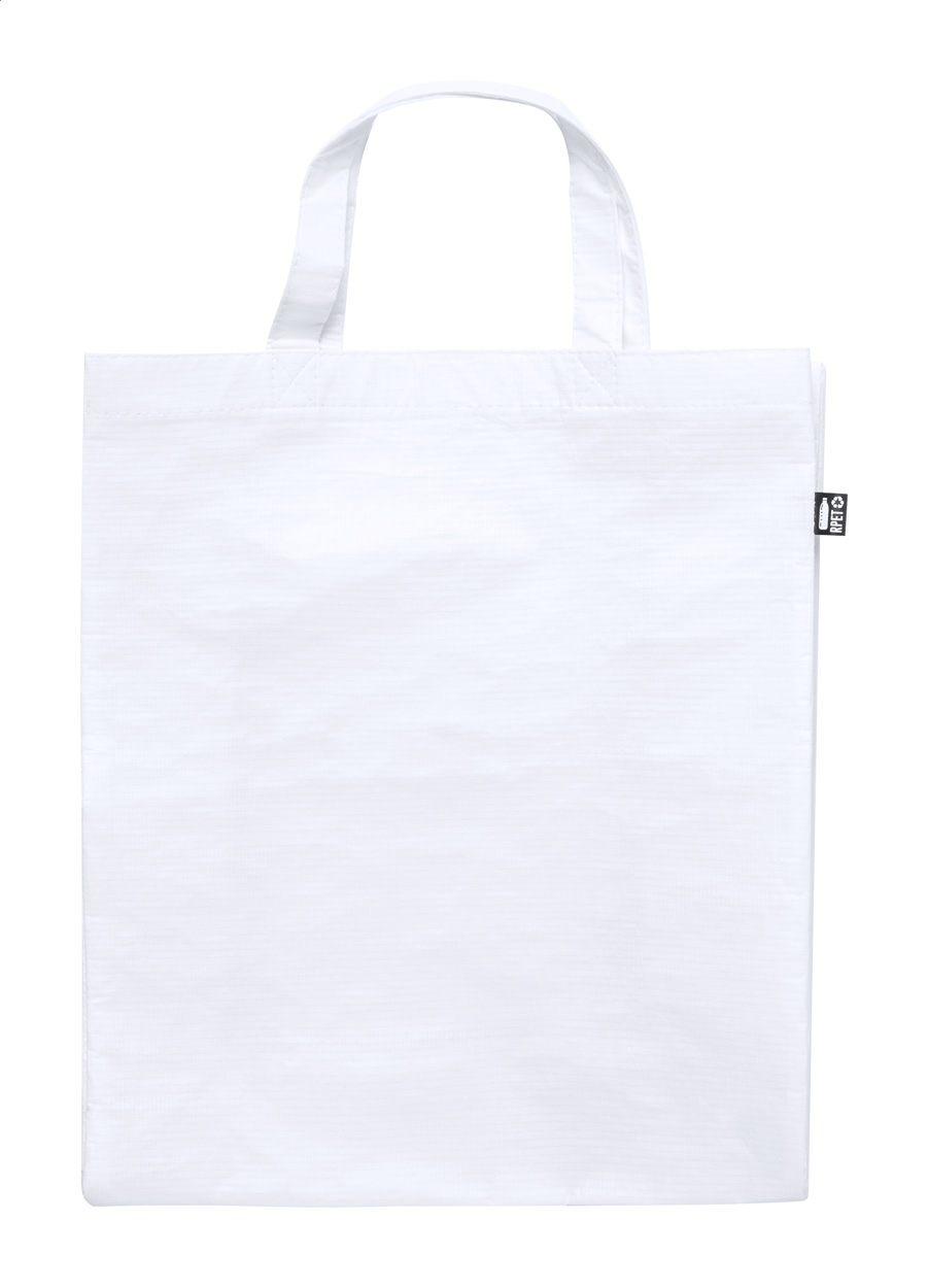 Nákupní taška z polaminovaného polyesteru RPET s klínem a krátkými uchy, 110 g/m2. S výrazným štítkem RPET.