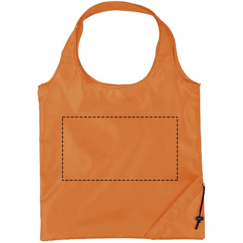 Skládací nákupní taška s otevřeným hlavním prostorem a se dvěma uchy. Tašku je možné složit do malé kapsičky se stahovací šňůrkou.