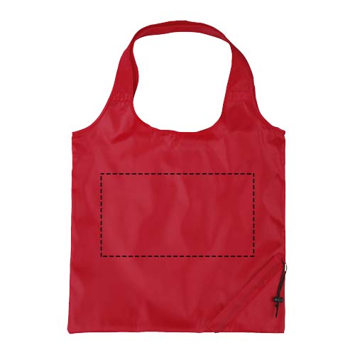 Skládací nákupní taška s otevřeným hlavním prostorem a se dvěma uchy. Tašku je možné složit do malé kapsičky se stahovací šňůrkou.