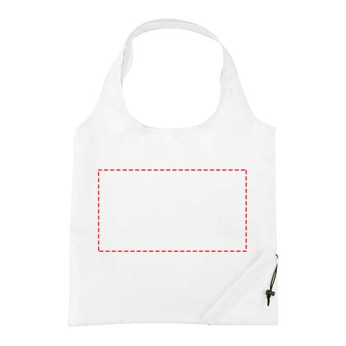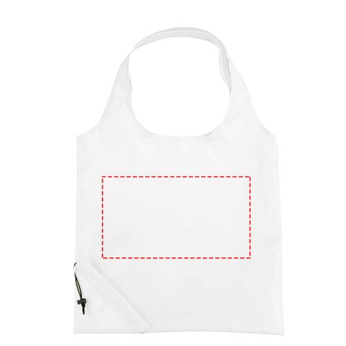 Skládací nákupní taška s otevřeným hlavním prostorem a se dvěma uchy. Tašku je možné složit do malé kapsičky se stahovací šňůrkou.