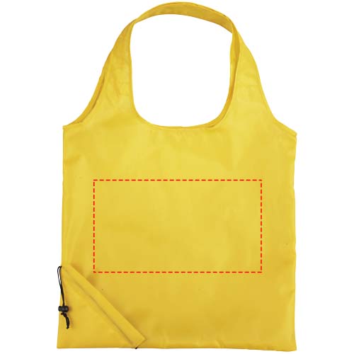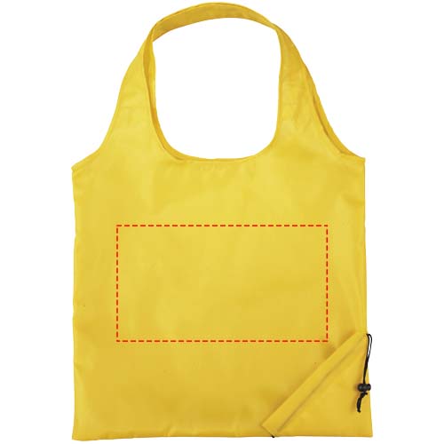 Skládací nákupní taška s otevřeným hlavním prostorem a se dvěma uchy. Tašku je možné složit do malé kapsičky se stahovací šňůrkou.