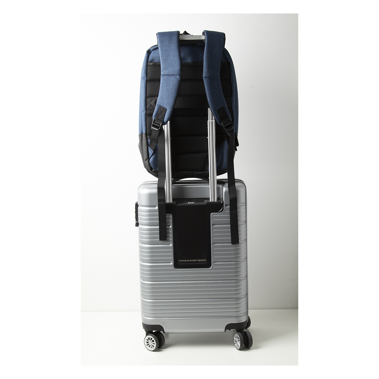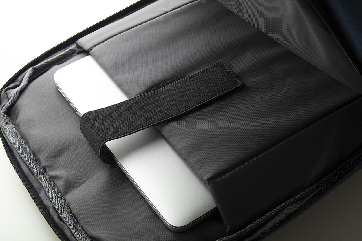 Dvoubarevný batoh s více přihrádkami na zip, množstvím vnitřních kapes, s polstrovanou přihrádkou na notebook (až 17palcový), ergonomickými zády a ramenními popruhy. Batoh má speciální kapsu s ochranou proti vykradení a popruh pro uchycení batohu k madlům kufru na kolečkách. Vestavěné USB pro připojení powerbanky. 400D polyester.