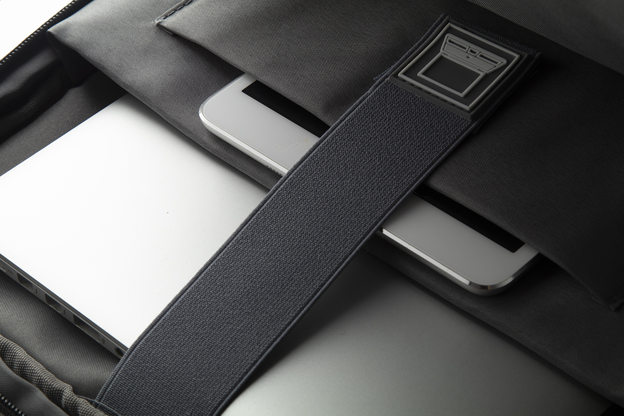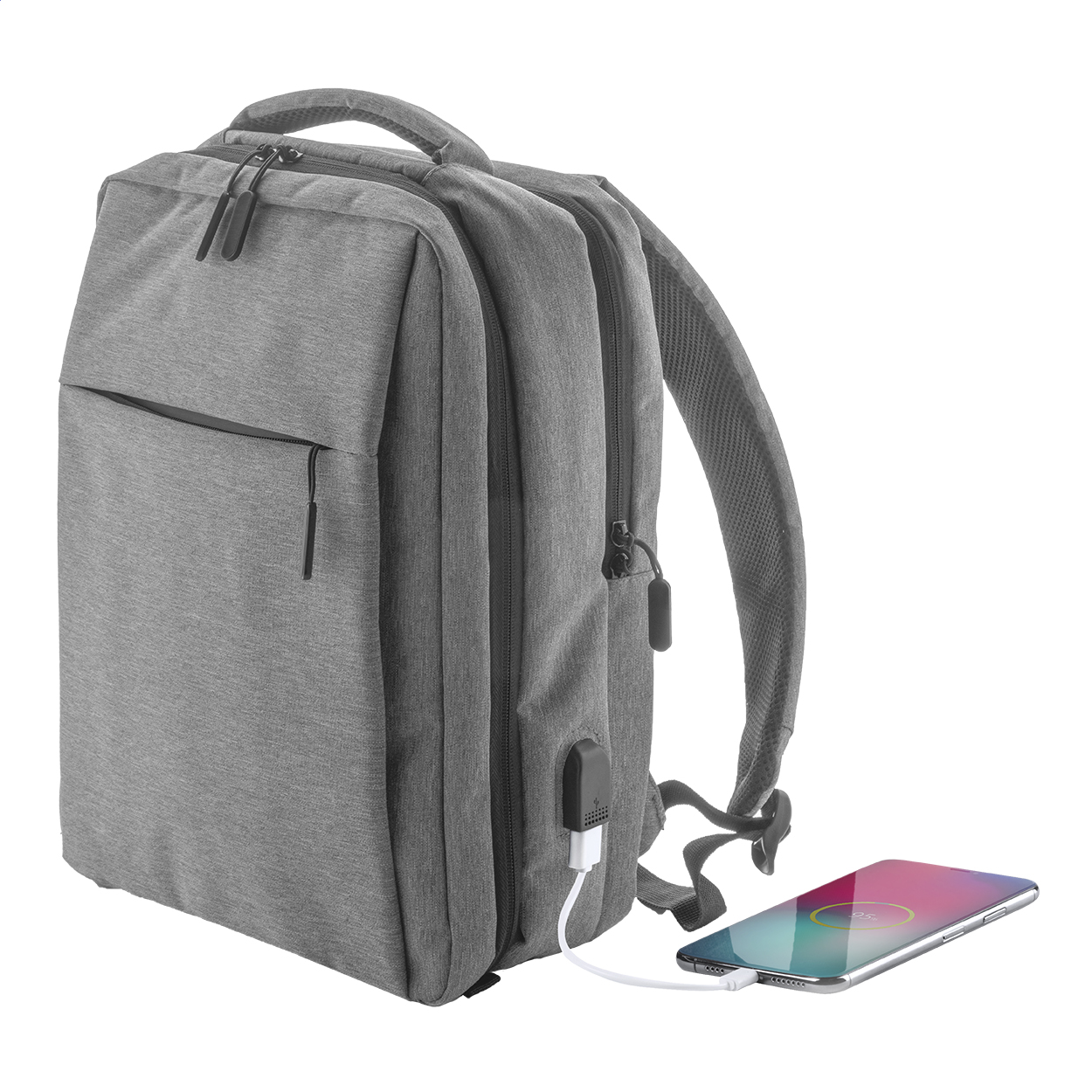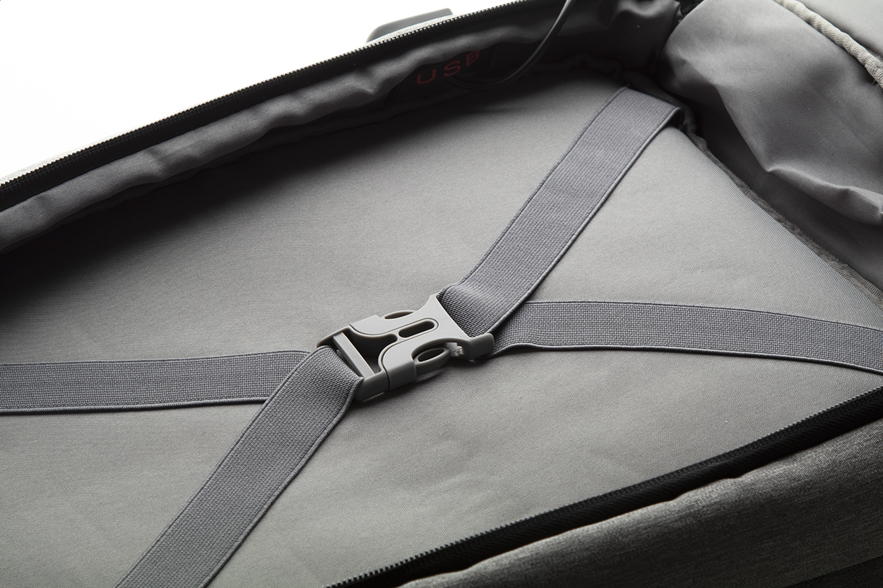 Batoh s několika přihrádkami na zip, vnitřními kapsami, polstrovaným prostorem pro notebook (až 17 palců) a tablet, ergonomickými zády a ramenními popruhy. S pásem pro připevnění na madla kufru na kolečkách a vestavěným USB pro připojení powerbanky. 400D polyester.